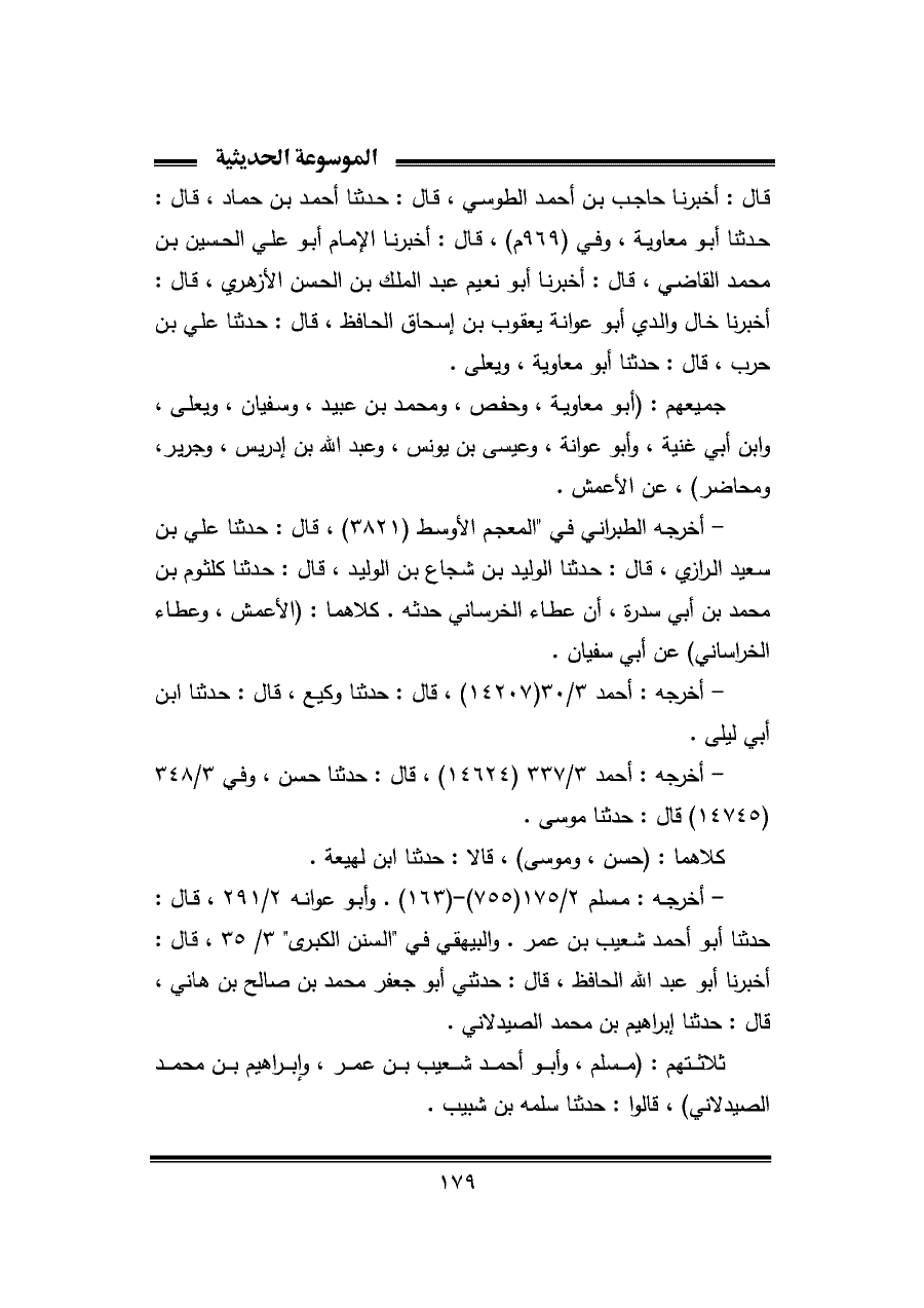 قال: أخبرنا حاجب بن أحمد الطوسي، قال: حدثنا أحمد بن حماد، قال: حدثنا أبو معاوية، وفي (٩٦٩ م)، قال: أخبرنا الإمام أبو علي الحسين بن محمد القاضي، قال: أخبرنا أبو نعيم عبد الملك بن الحسن الأزهري، قال: أخبرنا خال والدي أبو عوانة يعقوب بن إسحاق الحافظ، قال: حدثنا علي بن حرب، قال: حدثنا أبو معاوية، ويعلى.