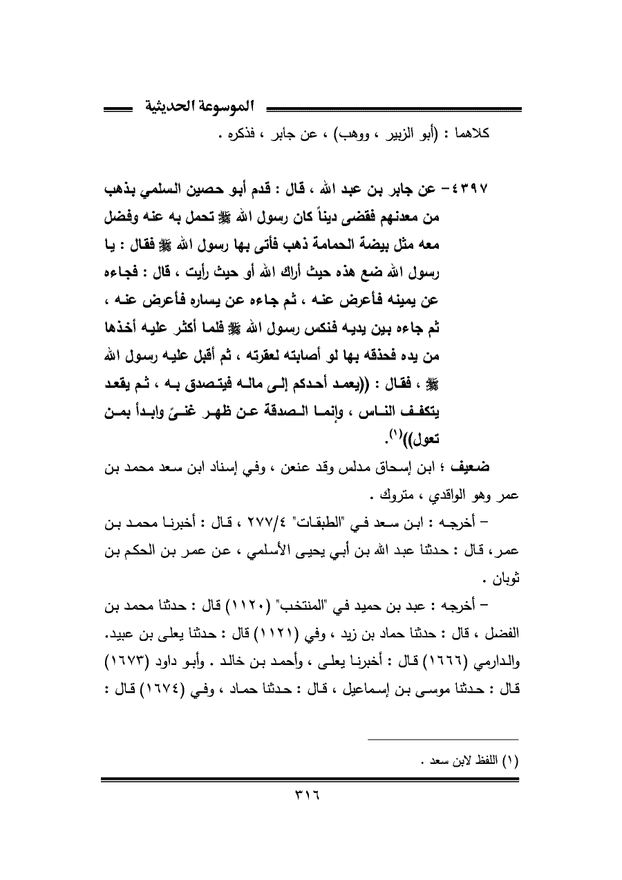 ٤٣٩٧ - عن جابر بن عبد اللّه، قال: قدم أبو حصين السلمي بذهب من معدنهم فقضى دينًا كان رسول اللّه - صلى الله عليه وسلم - تحمل به عنه وفضل معه مثل بيضة الحمامة ذهب فأتى بها رسول اللّه - صلى الله عليه وسلم - فقال: يا رسول اللّه ضع هذه حيث أراك اللّه أو حيث رأيت، قال: فجاءه عن يمينه فأعرض عنه، ثم جاءه عن يساره فأعرض عنه، ثم جاءه بين يديه فنكس رسول اللّه - صلى الله عليه وسلم - فلما أكثر عليه أخذها من يده فحذقه بها لو أصابته لعقرته، ثم أقبل عليه رسول اللّه - صلى الله عليه وسلم -، فقال: "يعمد أحدكم إلى ماله فيتصدق به، ثم يقعد يتكفف الناس، وإنما الصدقة عن ظهر غنىً وابدأ بمن تعول" (¬١).