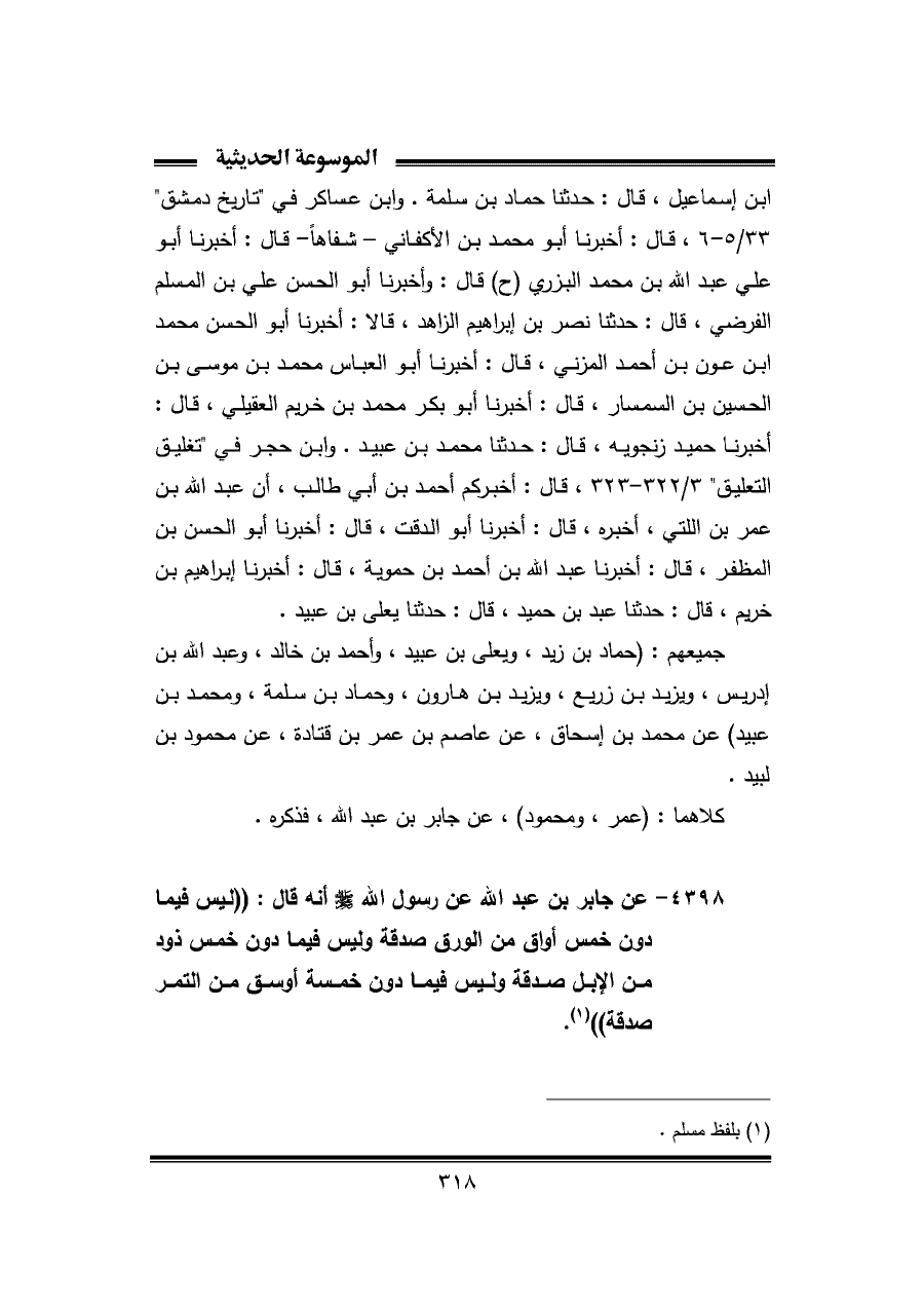 ٤٣٩٨ - عن جابر بن عبد اللّه عن رسول اللّه - صلى الله عليه وسلم - أنه قال: "ليس فيما دون خمس أواق من الورق صدقة وليس فيما دون خمس ذود من الإبل صدقة وليس فيما دون خمسة أوسق من التمر صدقة" (¬١).
