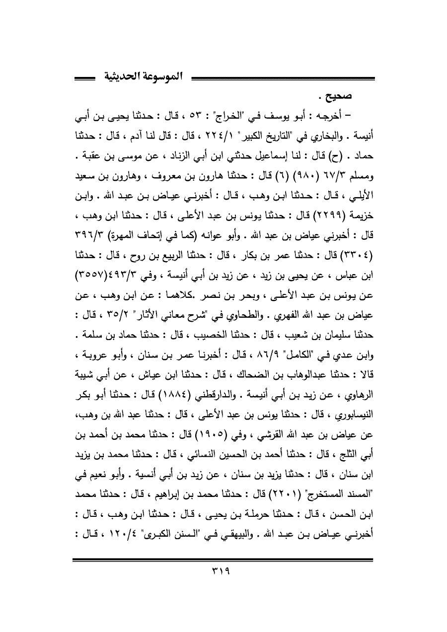 - أخرجه: أبو يوسف في "الخراج": ٥٣، قال: حَدَّثَنَا يحيى بن أبي أنيسة. والبخاري في "التاريخ الكبير" ١/ ٢٢٤، قال: قال لنا آدم، قال: حَدَّثَنَا حماد. (ح) قال: لنا إسماعيل حدثني ابن أبي الزناد، عن موسى بن عقبة. ومسلم ٣/ ٦٧ (٩٨) (٦) قال: حَدَّثَنَا هارون بن معروف، وهارون بن سعيد الأيلي، قال: حَدَّثَنَا ابن وهب، قال: أخبرني عياض بن عبد الله. وابن خزيمة (٢٢٩٩) قال: حَدَّثَنَا يونس بن عبد الأعلى، قال: حَدَّثَنَا ابن وهب، قال: أخبرني عياض بن عبد الله. وأبو عوانه (كما في إتحاف المهرة) ٣/ ٣٩٦ (٣٣٠٤) قال: حَدَّثَنَا عمر بن بكار، قال: حَدَّثَنَا الربيع بن روح، قال: حَدَّثَنَا ابن عباس، عن يحيى بن زيد، عن زيد بن أبي أنيسة، وفي ٣/ ٤٩٣ (٣٥٥٧) عن يونس بن عبد الأعلى، ويحر بن نصر. كلاهما: عن ابن وهب، عن عياض بن عبد الله الفهري. والطحاوي في "شرح معاني الآثار" ٢/ ٣٥، قال: حَدَّثَنَا سليمان بن شعيب، قال: حَدَّثَنَا الخصيب، قال: حَدَّثَنَا حماد بن سلمة. وابن عدي في "الكامل" ٩/ ٨٦، قال: أخبرنا عمر بن سنان، وأبو عروبة، قالا: حَدَّثَنَا عبد الوهاب بن الضحاك، قال: حَدَّثَنَا ابن عياش، عن أبي شيبة الرهاوي، عن زيد بن أبي أنيسة. والدارقطني (١٨٨٤) قال: حَدَّثَنَا أبو بكر النيسابوري، قال: حَدَّثَنَا يونس بن عبد الأعلى، قال: حَدَّثَنَا عبد الله بن وهب، عن عياض بن عبد الله القرشي، وفي (١٩٠٥) قال: حَدَّثَنَا محمد بن أحمد بن أبي التنج، قال: حَدَّثَنَا أحمد بن الحسين النسائي، قال: حَدَّثَنَا محمد بن يزيد بن سنان، قال: حَدَّثَنَا يزيد بن سنان، عن زيد بن أبي أنسية. وأبو نعيم في "المسند المستخرج" (٢٢٠١) قال: حَدَّثَنَا محمد بن إبراهيم، قال: حَدَّثَنَا محمد بن الحسن، قال: حَدَّثَنَا حرملة بن يحيى، قال: حَدَّثَنَا ابن وهب، قال: أخبرني عياض بن عبد الله. والبيهقي في "السنن الكبرى" ٤/ ١٢٠، قال: