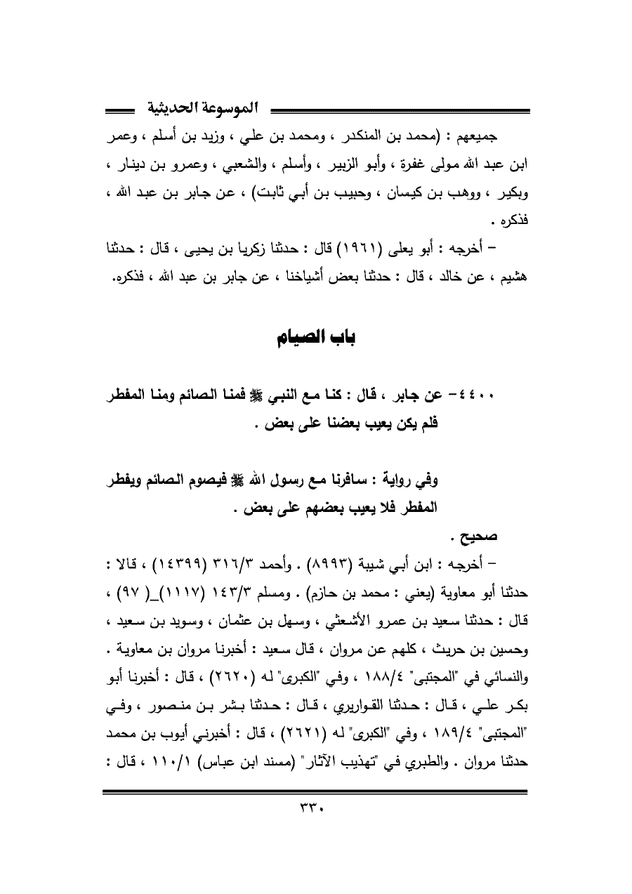 ٤٤٠٠ - عن جابر، قال: كنا مع النبي - صلى الله عليه وسلم - فمنا الصائم ومنا المفطر فلم يكن يعيب بعضنا على بعض.