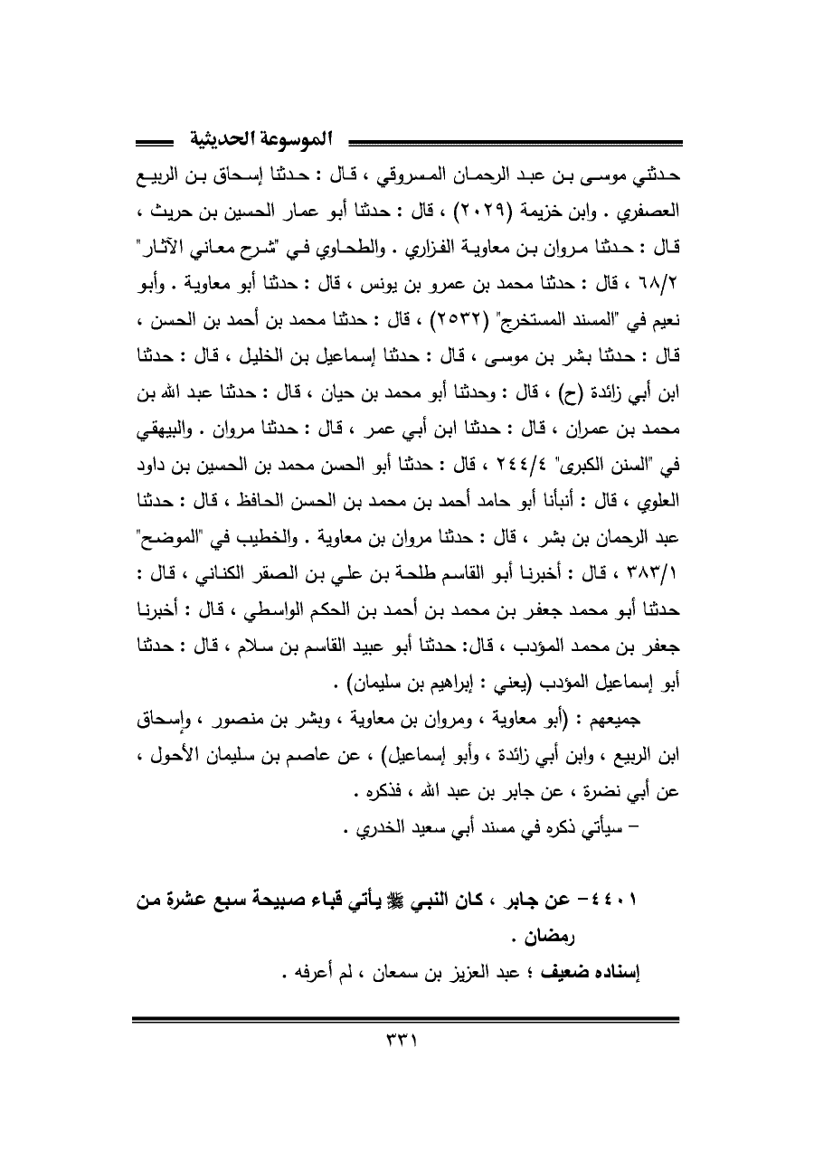 ٤٤٠١ - عن جابر، كان النبي - صلى الله عليه وسلم - يأتي قباء صبيحة سبع عشرة من رمضان.