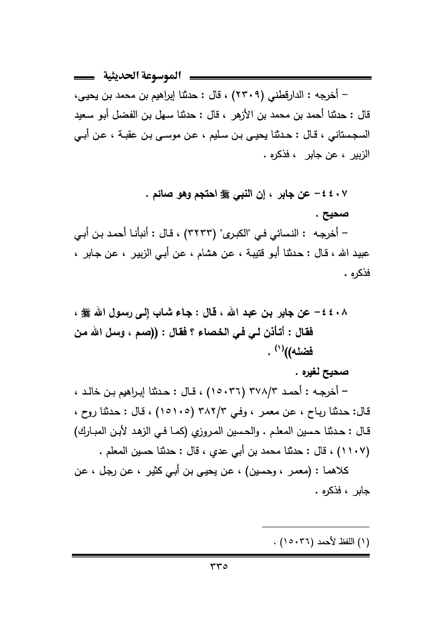 ٤٤٠٧ - عن جابر، إن النبي - صلى الله عليه وسلم - احتجم وهو صائم.