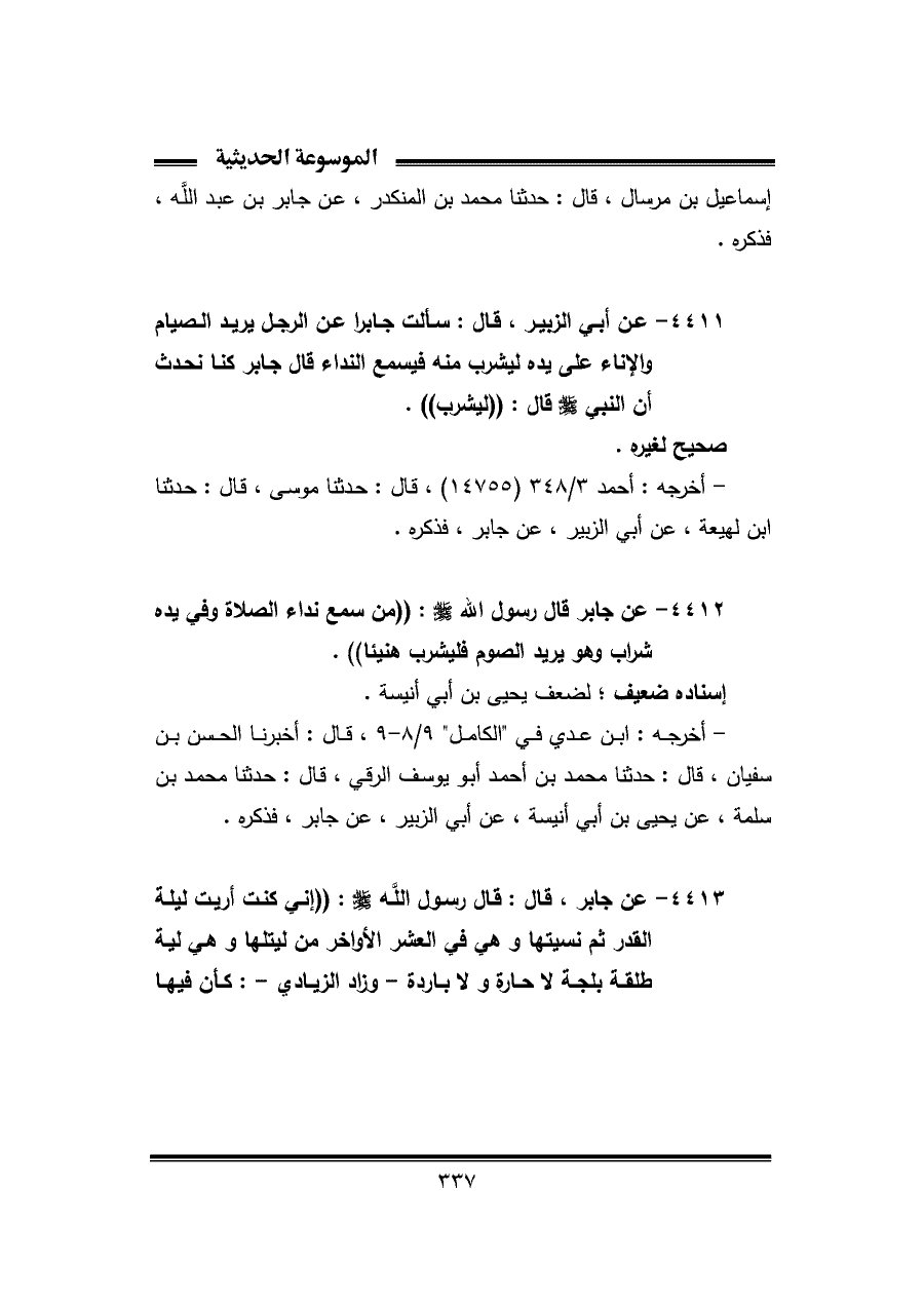 ٤٤١١ - عن أبي الزبير، قال: سألت جابرا عن الرجل يريد الصيام والإناء على يده ليشرب منه فيسمع النداء قال جابر كنا نحدث أن النبي - صلى الله عليه وسلم - قال: "ليشرب".