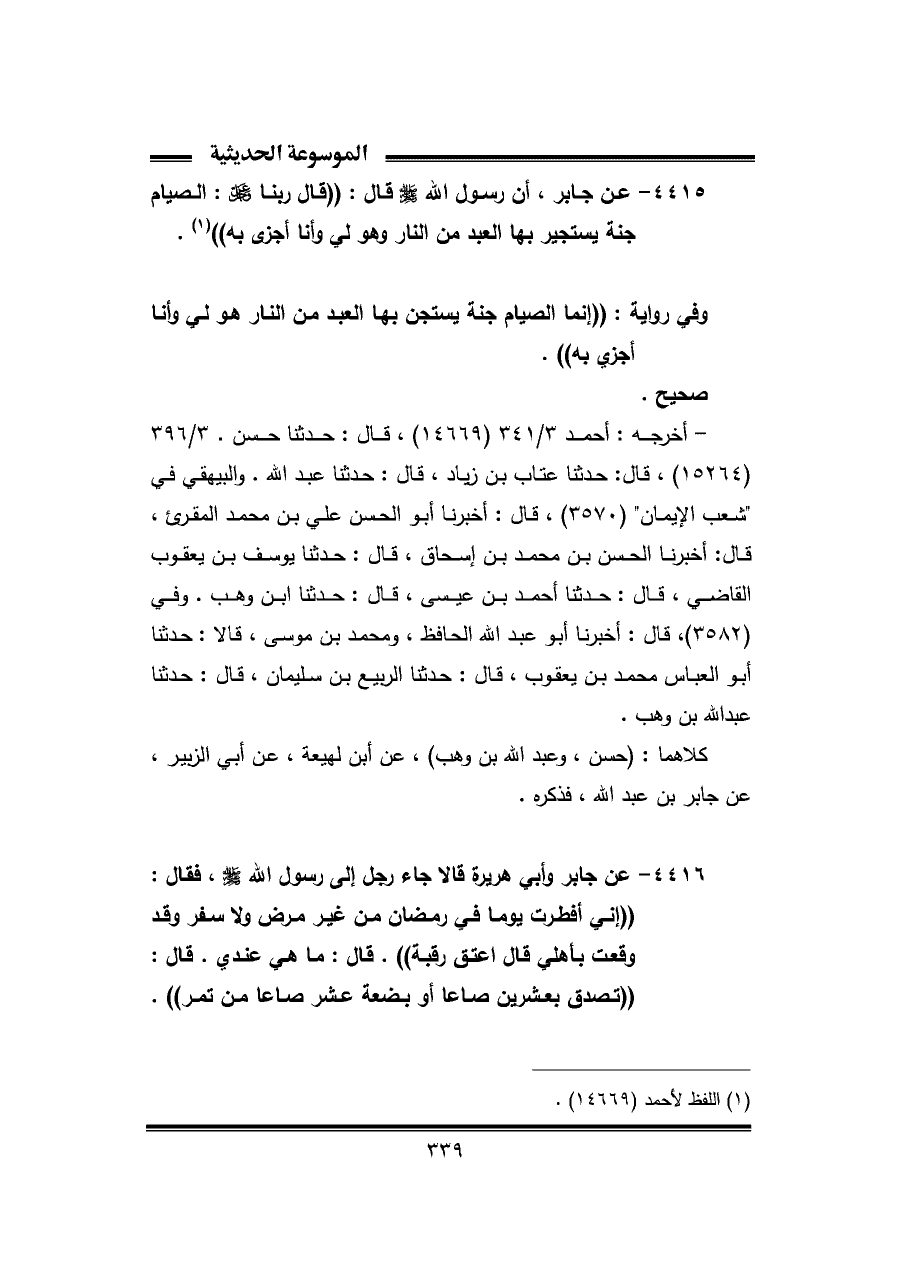 ٤٤١٥ - عن جابر، أن رسول الله - صلى الله عليه وسلم - قال: "قال ربنا عز وجل: الصيام جنة يستجير بها العبد من النار وهو لي وأنا أجزى به" (¬١).