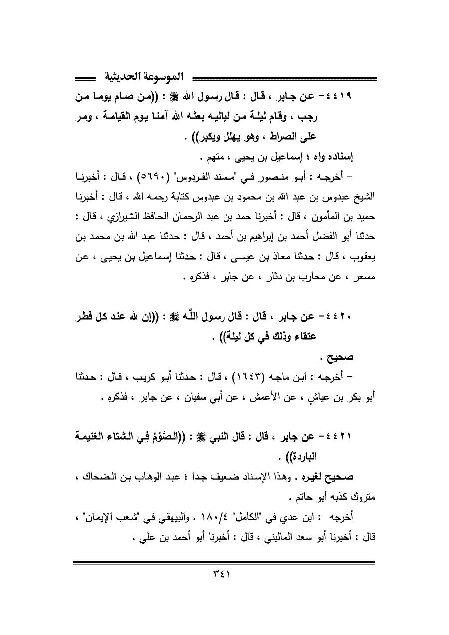 ٤٤١٩ - عن جابر، قال: قال رسول الله - صلى الله عليه وسلم -: "من صام يوما من رجب، وقام ليلة من لياليه بعثه الله آمنا يوم القيامة، ومر على الصراط، وهو يهلل ويكبر".