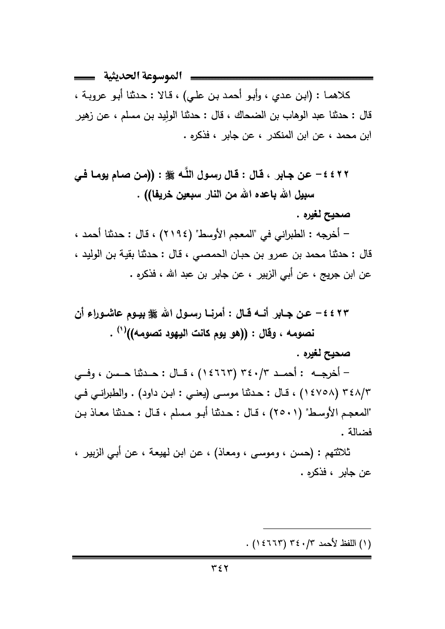 ٤٤٢٢ - عن جابر، قال: قال رسول الله - صلى الله عليه وسلم -: "من صام يوما في سبيل الله باعده الله من النار سبعين خريفا".