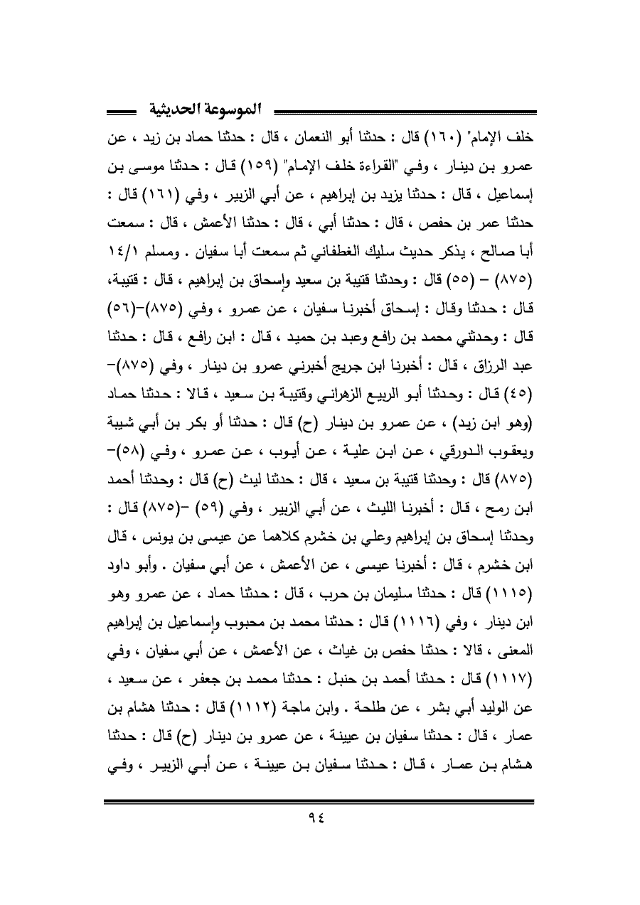 خلف الإمام" (١٦٠) قال: حدثنا أبو النعمان، قال: حدثنا حماد بن زيد، عن عمرو بن دينار، وفي "القراءة خلف الإمام" (١٥٩) قال: حدثنا موسى بن إسماعيل، قال: حدثنا يزيد بن إبراهيم، عن أبي الزبير، وفي (١٦١) قال: حدثنا عمر بن حفص، قال: حدثنا أبي، قال: حدثنا الأعمش، قال: سمعت أبا صالح، يذكر حديث سليك الغطفاني ثم سمعت أبا سفيان. ومسلم ١/ ١٤ (٨٧٥) - (٥٥) قال: وحدثنا قتيبة بن سعيد وإسحاق بن إبراهيم، قال: قتيبة، قال: حدثنا وقال: إسحاق أخبرنا سفيان، عن عمرو، وفي (٨٧٥) - (٥٦) قال: وحدثني محمد بن رافع وعبد بن حميد، قال: ابن رافع، قال: حدثنا عبد الرزاق، قال: أخبرنا ابن جريج أخبرني عمرو بن دينار، وفي (٨٧٥) - (٤٥) قال: وحدثنا أبو الربيع الزهراني وقتيبة بن سعيد، قالا: حدثنا حماد (وهو ابن زيد)، عن عمرو بن دينار (ح) قال: حدثنا أبو بكر بن أبي شيبة ويعقوب الدورقي، عن ابن علية، عن أيوب، عن عمرو، وفي (٥٨) - (٨٧٥) قال: وحدثنا قتيبة بن سعيد، قال: حدثنا ليث (ح) قال: وحدثنا أحمد ابن رمح، قال: أخبرنا الليث، عن أبي الزبير، وفي (٥٩) - (٨٧٥) قال: وحدثنا إسحاق بن إبراهيم وعلي بن خشرم كلاهما عن عيسى بن يونس، قال ابن خشرم، قال: أخبرنا عيسى، عن الأعمش، عن أبي سفيان. وأبو داود (١١١٥) قال: حدثنا سليمان بن حرب، قال: حدثنا حماد، عن عمرو وهو ابن دينار، وفي (١١١٦) قال: حدثنا محمد بن محبوب وإسماعيل بن إبراهيم المعنى، قالا: حدثنا حفص بن غياث، عن الأعمش، عن أبي سفيان، وفي (١١١٧) قال: حدثنا أحمد بن حنبل: حدثنا محمد بن جعفر، عن سعيد، عن الوليد أبي بشر، عن طلحة. وابن ماجه (١١١٢) قال: حدثنا هشام بن عمار، قال: حدثنا سفيان بن عيينة، عن عمرو بن دينار (ح) قال: حدثنا هشام بن عمار، قال: حدثنا سفيان بن عيينة، عن أبي الزبير، وفي