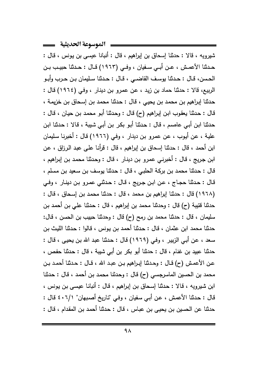 شيرويه، قالا: حدثنا إسحاق بن إبراهيم، قال: أنبأنا عيسى بن يونس، قال: حدثنا الأعمش، عن أبي سفيان، وفي (١٩٦٣) قال: حدثنا حبيب بن الحسن، قال: حدثنا يوسف القاضي، قال: حدثنا سليمان بن حرب وأبو الربيع، قالا: حدثنا حماد بن زيد، عن عمرو بن دينار، وفي (١٩٦٤) قال: حدثنا إبراهيم بن محمد بن يحيي، قال: حدثنا محمد بن إسحاق بن خزيمة، قال: حدثنا يعقوب ابن إبراهيم (ح) قال: وحدثنا أبو محمد بن حيان، قال: حدثنا ابن أبي عاصم، قال: حدثنا أبو بكر بن أبي شيبة، قالا: حدثنا ابن علية، عن أيوب، عن عمرو بن دينار، وفي (١٩٦٦) قال: أخبرنا سليمان ابن أحمد، قال: حدثنا إسحاق بن إبراهيم، قال: قرأنا على عبد الرزاق، عن ابن جريج، قال: أخبرني عمرو بن دينار، قال: وحدثنا محمد بن إبراهيم، قال: حدثنا محمد بن بركة الحلبي، قال: حدثنا يوسف بن سعيد بن مسلم، قال: حدثنا حجاج، عن ابن جريج، قال: حدثني عمرو بن دينار، وفي (١٩٦٨) قال: حدثنا إبراهيم بن محمد، قال: حدثنا محمد بن إسحاق، قال: حدثنا قتيبة (ح) قال: وحدثنا محمد بن إبراهيم، قال: حدثنا علي بن أحمد بن سليمان، قال: حدثنا محمد بن رمح (ح) قال: وحدثنا حبيب بن الحسن، قال: حدثنا محمد ابن عثمان، قال: حدثنا أحمد بن يونس، قالوا: حدثنا الليث بن سعد، عن أبي الزبير، وفي (١٩٦٩) قال: حدثنا عبد الله بن يحيى، قال: حدثنا عبيد بن غنام، قال: حدثنا أبو بكر بن أبي شيبة، قال: حدثنا حفص، عن الأعمش (ح) قال: وحدثنا إبراهيم بن عبد الله، قال: حدثنا أحمد بن محمد بن الحسين الماسرجسي (ح) قال: وحدثنا محمد بن أحمد، قال: حدثنا ابن شيرويه، قالا: حدثنا إسحاق بن إبراهيم، قال: أنبأنا عيسى بن يونس، قال: حدثنا الأعمش، عن أبي سفيان، وفي "تاريخ أصبهان" ١/ ٤٠٦ قال: حدثنا عن الحسين بن يحيى بن عباس، قال: حدثنا أحمد بن المقدام، قال: