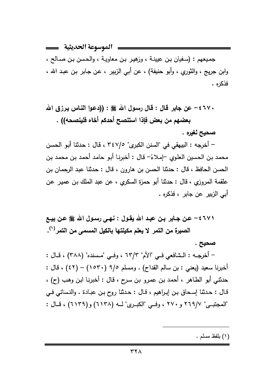 ٤٦٧٠ - عن جابر قال: قال رسول الله - صلى الله عليه وسلم -: "دعوا الناس يرزق الله بعضهم من بعض فإذا استنصح أحدكم أخاه فلينصحه".