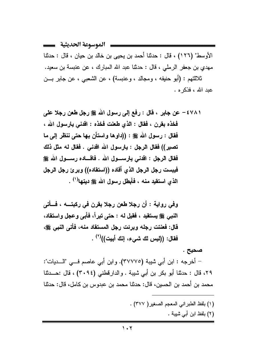 ٤٧٨١ - عن جابر، قال: رفع إلى رسول الله -صلى الله عليه وسلم- رجل طعن رجلا على فخذه بقرن، فقال: الذي طعنت فخذه: اقدني يا رسول الله، فقال: رسول الله -صلى الله عليه وسلم-: "داوها واستأن بها حتى ننظر إلى ما تصير" فقال الرجل: يا رسول الله اقدني. فقال له مثل ذلك فقال الرجل: اقدني يا رسول الله. فأقاده رسول الله -صلى الله عليه وسلم- فيبست رجل الرجل الذي أقاده "استقاده" وبرئ رجل الرجل الذي استقيد منه، فأبطل رسول الله -صلى الله عليه وسلم- ديتها (¬١).