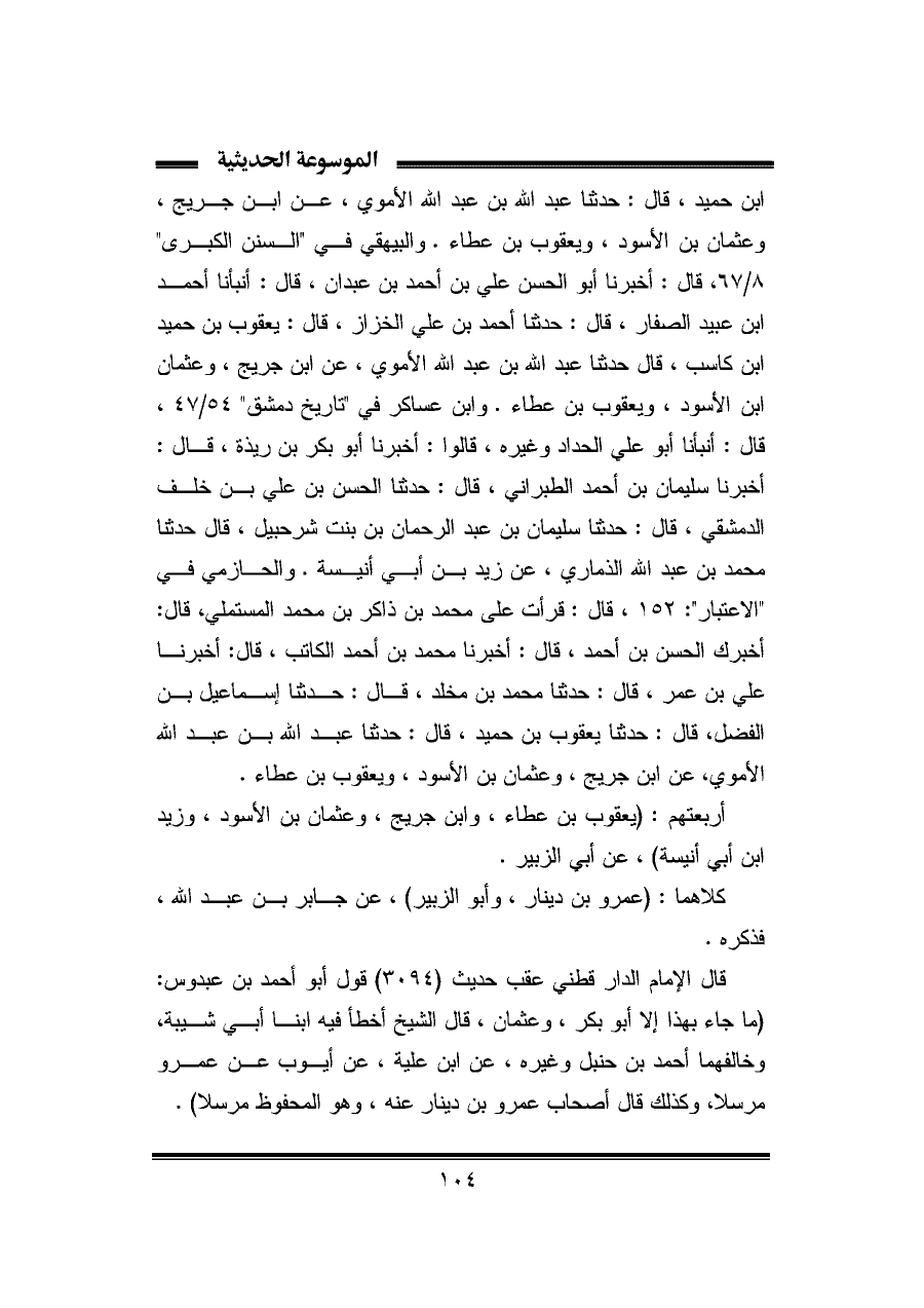 كلاهما: (عمرو بن دينار، وأبو الزبير)، عن جابر بن عبد الله، فذكره. قال الإمام الدارقطني عقب حديث (٣٠٩٤) قول أبو أحمد بن عبدوس: (ما جاء بهذا إلا أبو بكر، وعثمان، قال الشيخ أخطأ فيه ابنا أبي شيبة، وخالفهما أحمد بن حنبل وغيره، عن ابن علية، عن أيوب عن عمرو مرسلا، وكذلك قال أصحاب عمرو بن دينار عنه، وهو المحفوظ مرسلا).