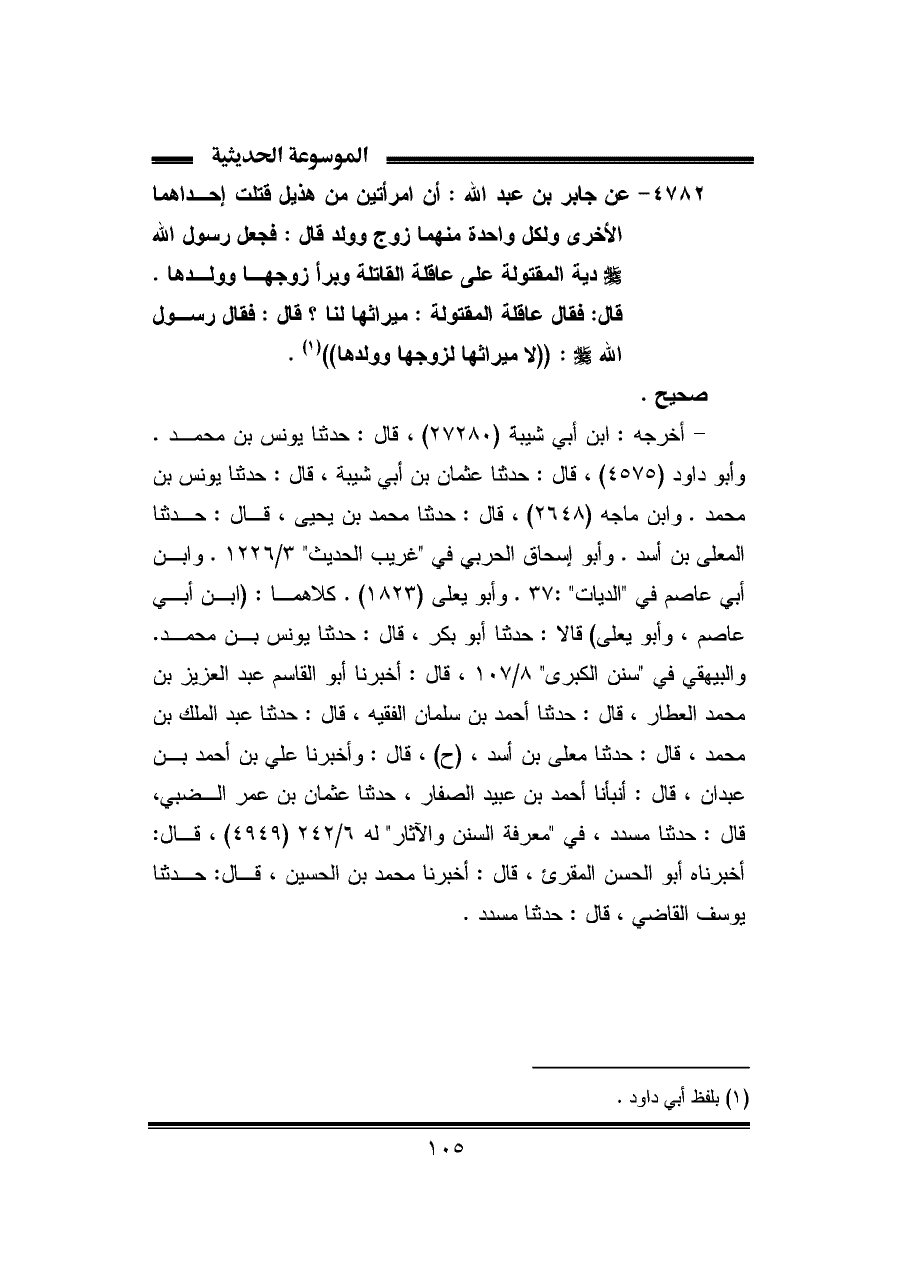 ٤٧٨٢ - عن جابر بن عبد الله: أن امرأتين من هذيل قتلت إحداهما الأخرى ولكل واحدة منهما زوج وولد قال: فجعل رسول الله - صلى الله عليه وسلم - دية المقتولة على عاقلة القاتلة وبرأ زوجها وولدها. قال: فقال عاقلة المقتولة: ميراثها لنا؟ قال: فقال رسول الله - صلى الله عليه وسلم -: "لا ميراثها لزوجها وولدها" (¬١).