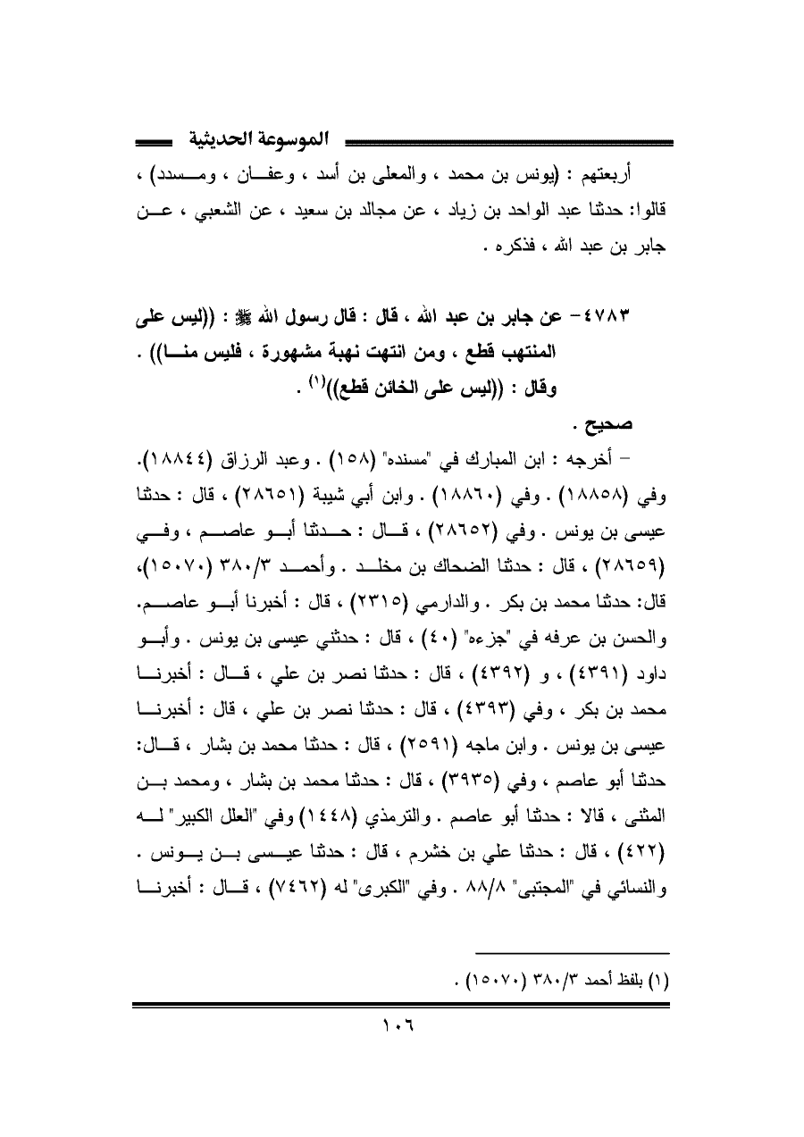 ٤٧٨٣ - عن جابر بن عبد الله، قال: قال رسول الله - صلى الله عليه وسلم-: "ليس على المنتهب قطع، ومن انتهت نهبة مشهورة، فليس منا".