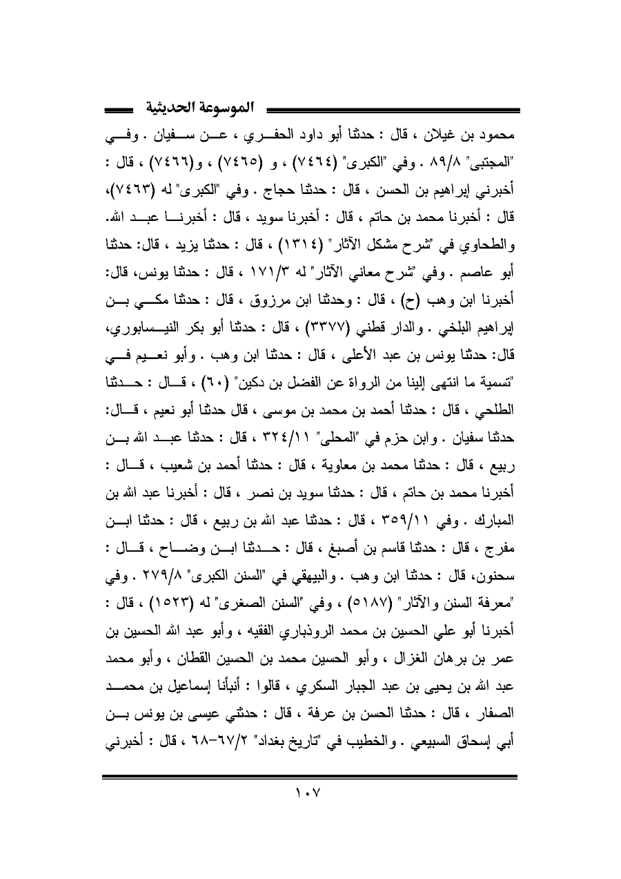 محمود بن غيلان، قال: حدثنا أبو داود الحفري، عن سفيان. وفي "المجتبى" ٨/ ٨٩. وفي "الكبرى" (٧٤٦٤)، و (٧٤٦٥)، و (٧٤٦٦)، قال: أخبرني إبراهيم بن الحسن، قال: حدثنا حجاج. وفي "الكبرى" له (٧٤٦٣)، قال: أخبرنا محمد بن حاتم، قال: أخبرنا سويد، قال: أخبرنا عبد الله. والطحاوي في "شرح مشكل الآثار" (١٣١٤)، قال: حدثنا يزيد، قال: حدثنا أبو عاصم. وفي "شرح معاني الآثار" له ٣/ ١٧١، قال: حدثنا يونس، قال: أخبرنا ابن وهب (ح)، قال: وحدثنا ابن مرزوق، قال: حدثنا مكي بن إبراهيم البلخي. والدارقطني (٣٣٧٧)، قال: حدثنا أبو بكر النيسابوري، قال: حدثنا يونس بن عبد الأعلى، قال: حدثنا ابن وهب. وأبو نعيم في "تسمية ما انتهى إلينا من الرواة عن الفضل بن دكين" (٦٠)، قال: حدثنا الطلحي، قال: حدثنا أحمد بن محمد بن موسى، قال حدثنا أبو نعيم، قال: حدثنا سفيان. وابن حزم في "المحلى" ١١/ ٣٢٤، قال: حدثنا عبد الله بن ربيع، قال: حدثنا محمد بن معاوية، قال: حدثنا أحمد بن شعيب، قال: أخبرنا محمد بن حاتم، قال: حدثنا سويد بن نصر، قال: أخبرنا عبد الله بن المبارك. وفي ١١/ ٣٥٩، قال: حدثنا عبد الله بن ربيع، قال: حدثنا ابن مفرج، قال: حدثنا قاسم بن أصبغ، قال: حدثنا ابن وضاح، قال: سحنون، قال: حدثنا ابن وهب. والبيهقي في "السنن الكبرى" ٨/ ٢٧٩. وفي "معرفة السنن والآثار" (٥١٨٧)، وفي "السنن الصغرى" له (١٥٢٣)، قال: أخبرنا أبو علي الحسين بن محمد الروذباري الفقيه، وأبو عبد الله الحسين بن عمر بن برهان الغزال، وأبو الحسين محمد بن الحسين القطان، وأبو محمد عبد الله بن يحيى بن عبد الجبار السكري، قالوا: أنبأنا إسماعيل بن محمد الصفار، قال: حدثنا الحسن بن عرفة، قال: حدثني عيسى بن يونس بن أبي إسحاق السبيعي. والخطيب في "تاريخ بغداد" ٢/ ٦٧ - ٦٨، قال: أخبرني