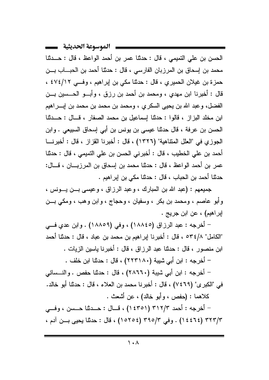 الحسن بن علي التميمي، قال: حدثنا عمر بن أحمد الواعظ، قال: حدثنا محمد بن إسحاق بن المرزبان الفارسي، قال: حدثنا أحمد بن الحباب بن حمزة بن غيلان الحميري، قال: حدثنا مكي بن إبراهيم، وفي ١٢/ ٤٧٤، قال: أخبرنا ابن مهدي، ومحمد بن أحمد بن رزق، وأبو الحسين بن الفضل، وعبد الله بن يحيى السكري، ومحمد بن محمد بن محمد بن إبراهيم ابن مخلد البزاز، قالوا: حدثنا إسماعيل بن محمد الصفار، قال: حدثنا الحسن بن عرفة، قال حدثنا عيسى بن يونس بن أبي إسحاق السبيعي. وابن الجوزي في "العلل المنتاهية" (١٣٢٦)، قال: أخبرنا القزاز، قال: أخبرنا أحمد بن علي الخطيب، قال: أخبرني الحسن بن علي التميمي، قال: حدثنا عمر بن أحمد الواعظ، قال: حدثنا محمد بن إسحاق بن المرزبان، قال: حدثنا أحمد بن الحباب، قال: حدثنا مكي بن إبراهيم.