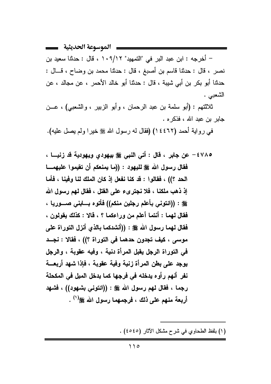 ٤٧٨٥ - عن جابر، قال: أتي النبي -صلى الله عليه وسلم- بيهودي ويهودية قد زنيا، فقال رسول الله -صلى الله عليه وسلم- لليهود: "ما يمنعكم أن تقيموا عليهما الحد؟ "، فقالوا: قد كنا نفعل إذ كان الملك لنا وفينا، فأما إذ ذهب ملكنا، فلا نجترئ على القتل، فقال لهم رسول الله -صلى الله عليه وسلم-: "ائتوني بأعلم رجلين منكم" فأتوه بابني صوريا، فقال لهما: أنتما أعلم من وراءكما؟، قالا: كذلك يقولون، فقال لهما رسول الله -صلى الله عليه وسلم-: "أنشدكما بالذي أنزل التوراة على موسى، كيف تجدون حدهما في التوراة؟ "، فقالا: نجد في التوراة الرجل يقبل المرأة دنية، وفيه عقوبة، والرجل يوجد على بطن المرأة زنية وفية عقوبة، فإذا شهد أربعة نفر أنهم رأوه يدخله في فرجها كما يدخل الميل في المكحلة رجما، فقال لهم رسول الله -صلى الله عليه وسلم-: "ائتوني بشهود"، فشهد أربعة منهم على ذلك، فرجمهما رسول الله -صلى الله عليه وسلم- (¬١).