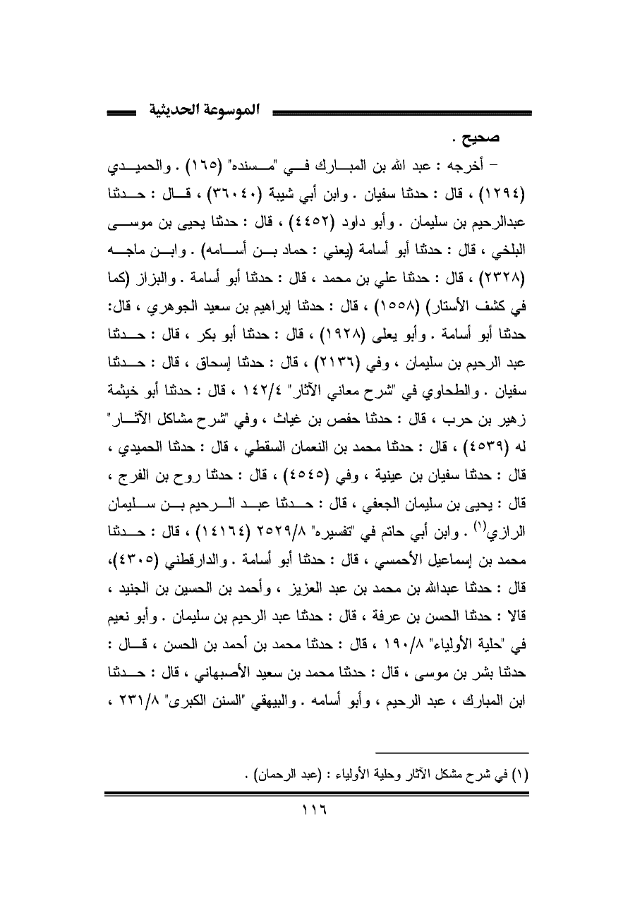 - أخرجه: عبد الله بن المبارك في "مسنده" (١٦٥). والحميدي (١٢٩٤)، قال: حدثنا سفيان. وابن أبي شيبة (٣٦٠٤٠)، قال: حدثنا عبد الرحيم بن سليمان. وأبو داود (٤٤٥٢)، قال: حدثنا يحيى بن موسى البلخي، قال: حدثنا أبو أسامة (يعني: حماد بن أسامة). وابن ماجه (٢٣٢٨)، قال: حدثنا علي بن محمد، قال: حدثنا أبو أسامة. والبزاز (كما في كشف الأستار) (١٥٥٨)، قال: حدثنا إبراهيم بن سعيد الجوهري، قال: حدثنا أبو أسامة. وأبو يعلى (١٩٢٨)، قال: حدثنا أبو بكر، قال: حدثنا عبد الرحيم بن سليمان، وفي (٢١٣٦)، قال: حدثنا إسحاق، قال: حدثنا سفيان. والطحاوي في "شرح معاني الآثار" ٤/ ١٤٢، قال: حدثنا أبو خيثمة زهير بن حرب، قال: حدثنا حفص بن غياث، وفي "شرح مشاكل الآثار" له (٤٥٣٩)، قال: حدثنا محمد بن النعمان السقطي، قال: حدثنا الحميدي، قال: حدثنا سفيان بن عينية، وفي (٤٥٤٥)، قال: حدثنا روح بن الفرج، قال: يحيى بن سليمان الجعفي، قال: حدثنا عبد الرحيم بن سليمان الرازي (¬١). وابن أبي حاتم في "تفسيره" ٨/ ٢٥٢٩ (١٤١٦٤)، قال: حدثنا محمد بن إسماعيل الأحمسي، قال: حدثنا أبو أسامة. والدارقطني (٤٣٠٥)، قال: حدثنا عبد الله بن محمد بن عبد العزيز، وأحمد بن الحسين بن الجنيد، قالا: حدثنا الحسن بن عرفة، قال: حدثنا عبد الرحيم بن سليمان. وأبو نعيم في "حلية الأولياء" ٨/ ١٩٠، قال: حدثنا محمد بن أحمد بن الحسن، قال: حدثنا بشر بن موسى، قال: حدثنا محمد بن سعيد الأصبهاني، قال: حدثنا ابن المبارك، عبد الرحيم، وأبو أسامة. والبيهقي "السنن الكبرى" ٨/ ٢٣١،
