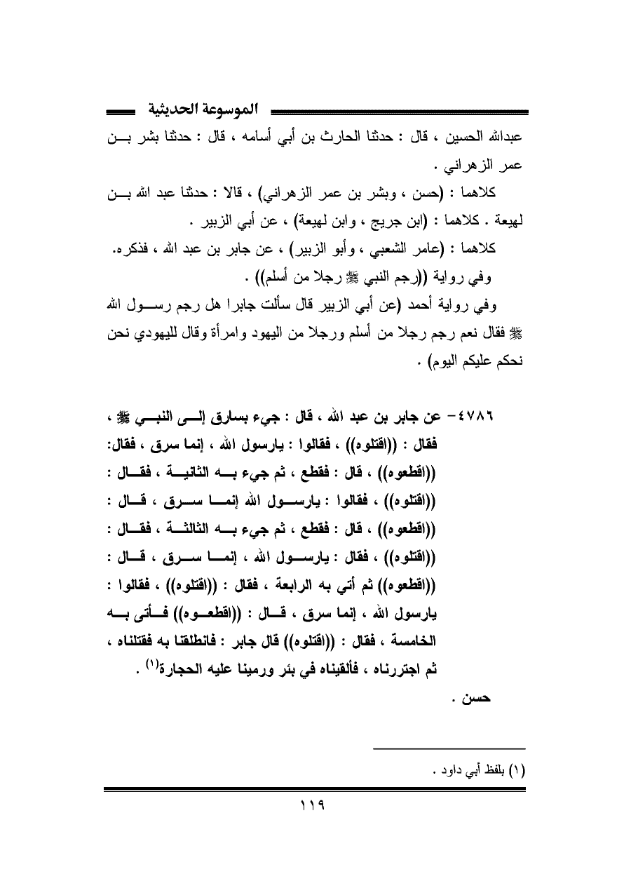 ٤٧٨٦ - عن جابر بن عبد الله، قال: جيء بسارق إلى النبي -صلى الله عليه وسلم-، فقال: "اقتلوه"، فقالوا: يا رسول الله، إنما سرق، فقال: "اقطعوه"، قال: فقطع، ثم جيء به الثانية، فقال: "اقتلوه"، فقالوا: يا رسول الله إنما سرق، قال: "اقطعوه"، قال: فقطع، ثم جيء به الثالثة، فقال: "اقتلوه"، فقال: يا رسول الله، إنما سرق، قال: "اقطعوه"، ثم أتي به الرابعة، فقال: "اقتلوه"، فقالوا: يا رسول الله، إنما سرق، قال: "اقطعوه" فأتى به الخامسة، فقال: "اقتلوه" قال جابر: فانطلقنا به فقتلناه، ثم اجتررناه، فألقيناه في بئر ورمينا عليه الحجارة (¬١).