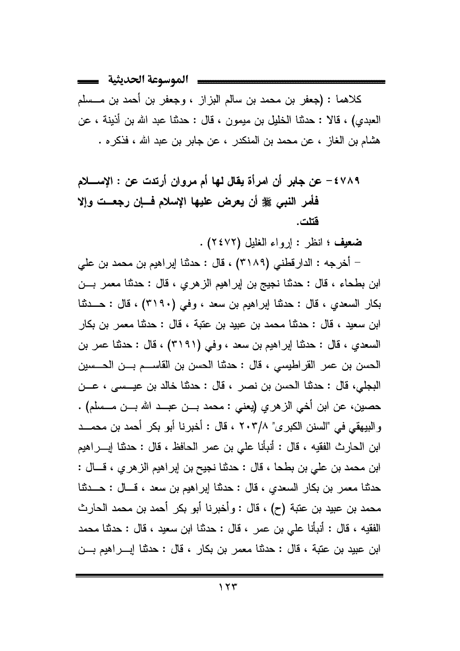 ٤٧٨٩ - عن جابر أن امرأة يقال لها أم مروان أرتدت عن: الإسلام فأمر النبي -صلى الله عليه وسلم- أن يعرض عليها الإسلام فإن رجعت وإلا قتلت.