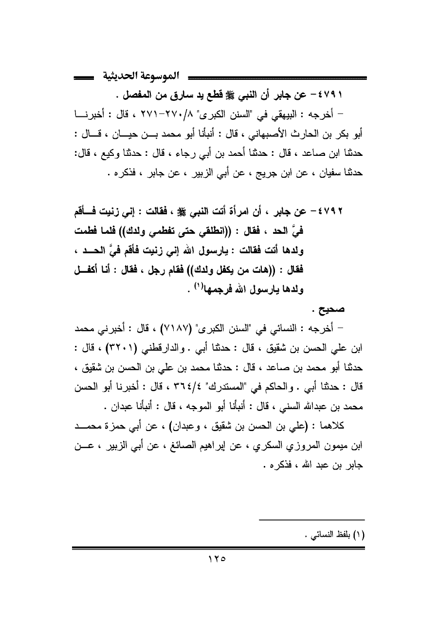 ٤٧٩١ - عن جابر أن النبي -صلى الله عليه وسلم- قطع يد سارق من المفصل.