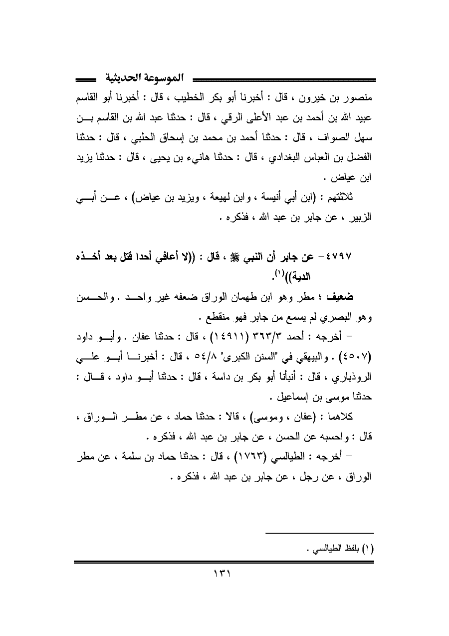 ٤٧٩٧ - عن جابر أن النبي -صلى الله عليه وسلم-، قال: "لا أعافي أحدا قتل بعد أخذه الدية" (¬١).
