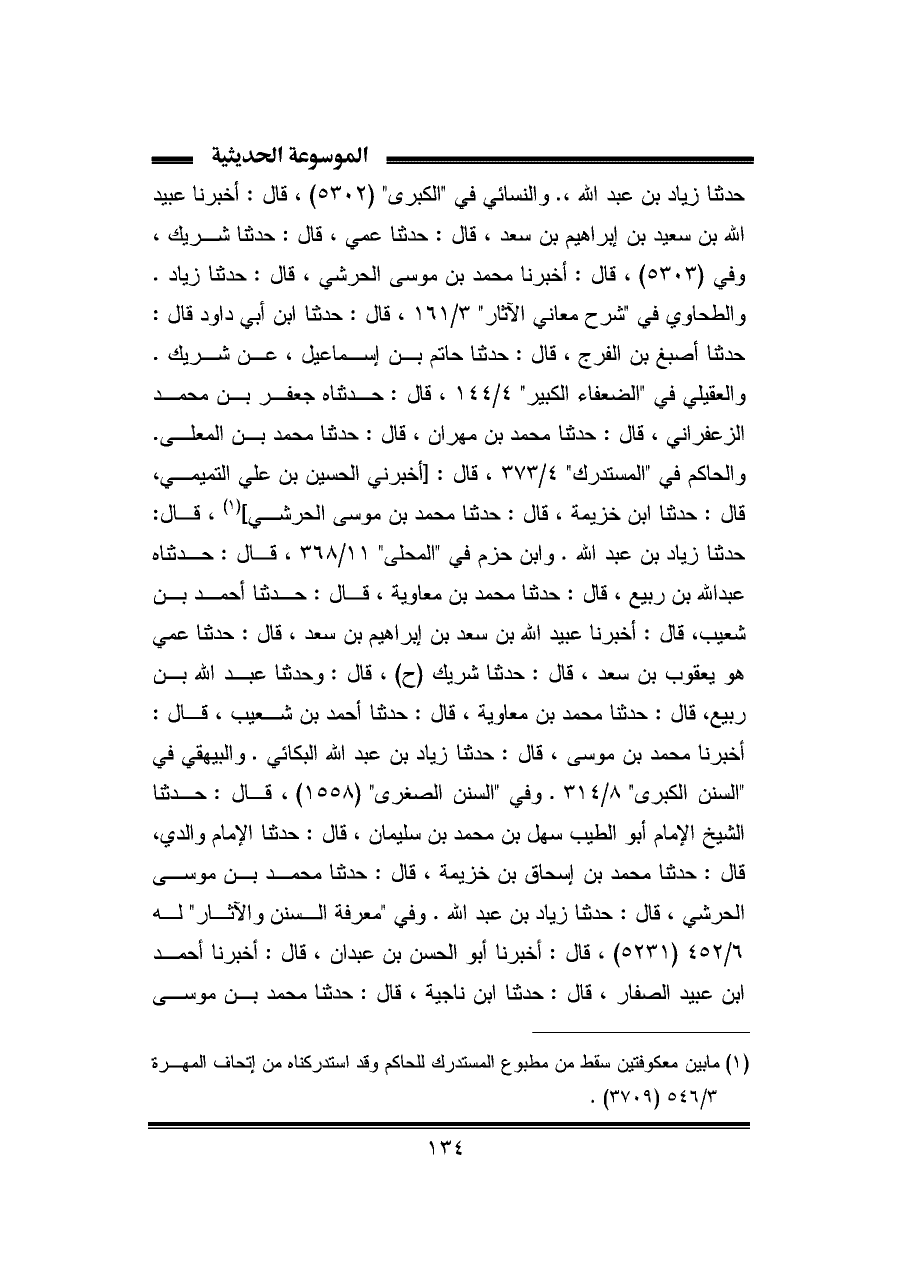 حدثنا زياد بن عبد الله، والنسائي في "الكبرى" (٥٣٠٢)، قال: أخبرنا عبيد الله بن سعيد بن إبراهيم بن سعد، قال: حدثنا عمي، قال: حدثنا شريك، وفي (٥٣٠٣)، قال: أخبرنا محمد بن موسى الحرشي، قال: حدثنا زياد. والطحاوي في "شرح معاني الآثار" ٣/ ١٦١، قال: حدثنا ابن أبي داود قال: حدثنا أصبغ بن الفرج، قال: حدثنا حاتم بن إسماعيل، عن شريك. والعقيلي في "الضعفاء الكبير" ٤/ ١٤٤، قال: حدثناه جعفر بن محمد الزعفراني، قال: حدثنا محمد بن مهران، قال: حدثنا محمد بن المعلى. والحاكم في "المستدرك" ٤/ ٣٧٣، قال: [أخبرني الحسين بن علي التميمي، قال: حدثنا ابن خزيمة، قال: حدثنا محمد بن موسى الحرشي] (¬١)، قال: حدثنا زياد بن عبد الله. وابن حزم في "المحلى" ١١/ ٣٦٨، قال: حدثناه عبد الله بن ربيع، قال: حدثنا محمد بن معاوية، قال: حدثنا أحمد بن شعيب، قال: أخبرنا عبيد الله بن سعد بن إبراهيم بن سعد، قال: حدثنا عمي هو يعقوب بن سعد، قال: حدثنا شريك (ح)، قال: وحدثنا عبد الله بن ربيع، قال: حدثنا محمد بن معاوية، قال: حدثنا أحمد بن شعيب، قال: أخبرنا محمد بن موسى، قال: حدثنا زياد بن عبد الله البكائي. والبيهقي في "السنن الكبرى" ٨/ ٣١٤. وفي "السنن الصغرى" (١٥٥٨)، قال: حدثنا الشيخ الإمام أبو الطيب سهل بن محمد بن سليمان، قال: حدثنا الإمام والدي، قال: حدثنا محمد بن إسحاق بن خزيمة، قال: حدثنا محمد بن موسى الحرشي، قال: حدثنا زياد بن عبد الله. وفي "معرفة السنن والآثار" له ٦/ ٤٥٢ (٥٢٣١)، قال: أخبرنا أبو الحسن بن عبدان، قال: أخبرنا أحمد ابن عبيد الصفار، قال: حدثنا ابن ناجية، قال: حدثنا محمد بن موسى