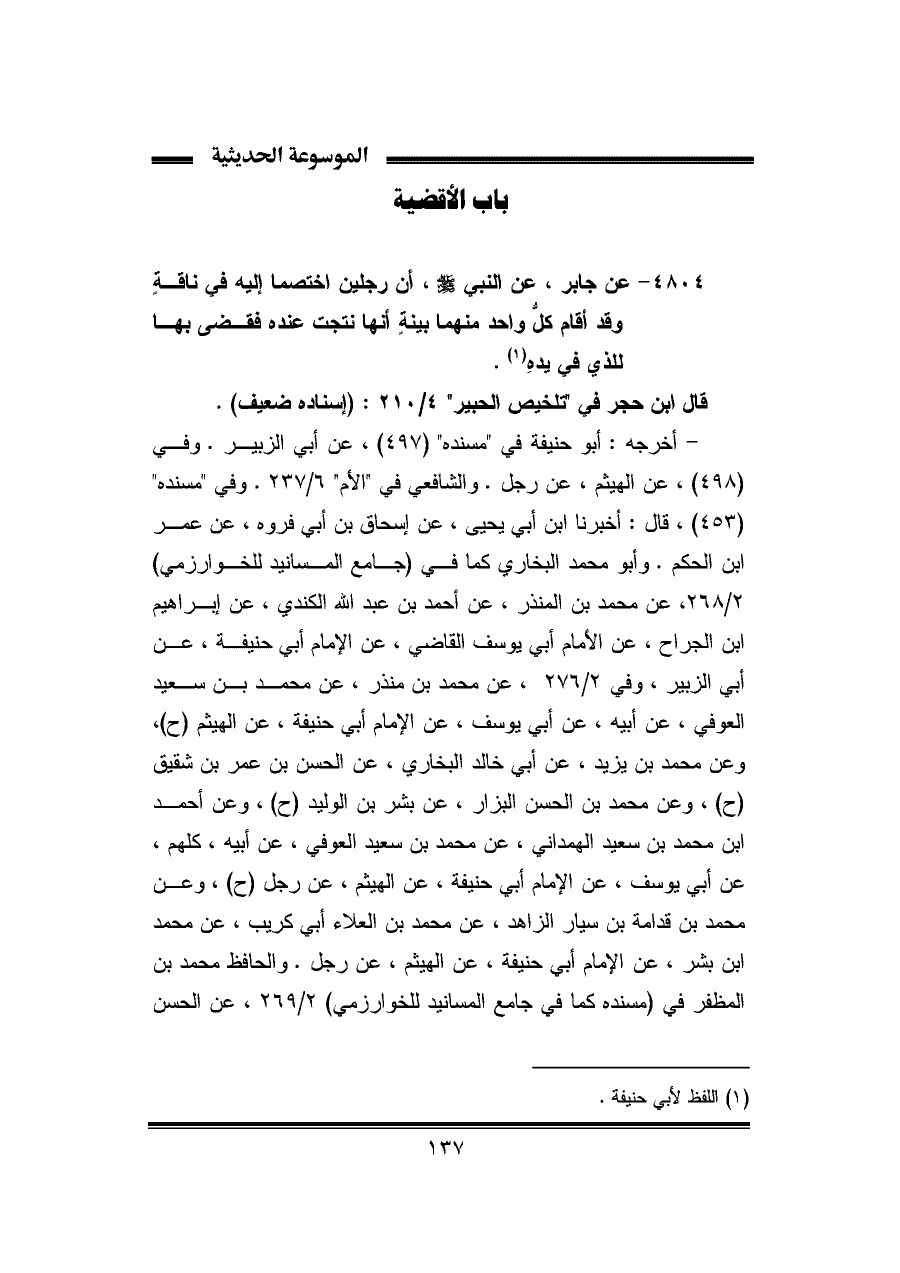 ٤٨٠٤ - عن جابر، عن النبي -صلى الله عليه وسلم-، أن رجلين اختصما إليه في ناقةٍ وقد أقام كل واحد منهما بينةٍ أنها نتجت عنده فقضى بها للذي في يدهِ (¬١).
