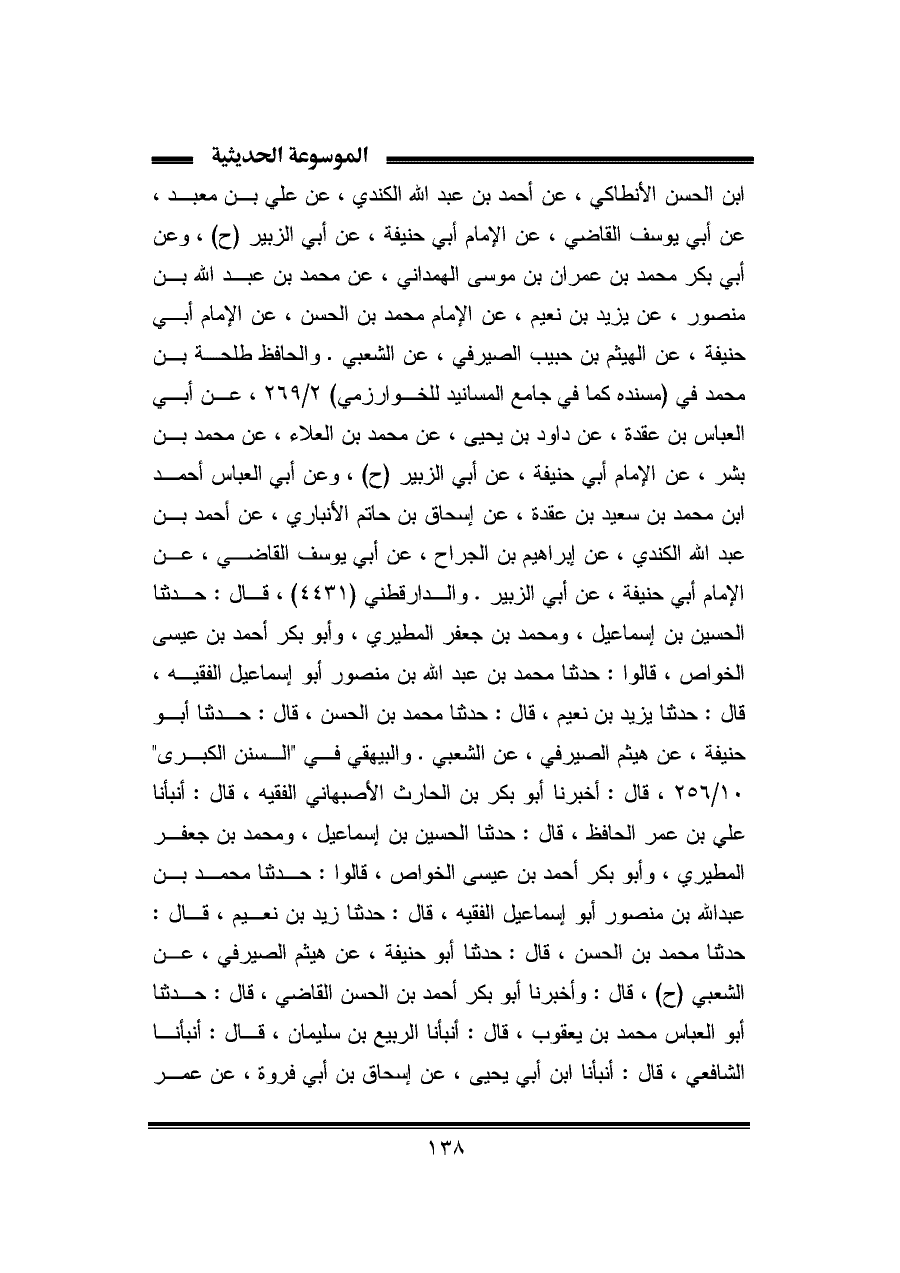 ابن الحسن الأنطاكي، عن أحمد بن عبد الله الكندي، عن علي بن معبد، عن أبي يوسف القاضي، عن الإمام أبي حنيفة، عن أبي الزبير (ح)، وعن أبي بكر محمد بن عمران بن موسى الهمداني، عن محمد بن عبد الله بن منصور، عن يزيد بن نعيم، عن الإمام محمد بن الحسن، عن الإمام أبي حنيفة، عن الهيثم بن حبيب الصيرفي، عن الشعبي. والحافظ طلحة بن محمد في (مسنده كما في جامع المسانيد للخوارزمي) ٢/ ٢٦٩، عن أبي العباس بن عقدة، عن داود بن يحيى، عن محمد بن العلاء، عن محمد بن بشر، عن الإمام أبي حنيفة، عن أبي الزبير (ح)، وعن أبي العباس أحمد ابن محمد بن سعيد بن عقدة، عن إسحاق بن حاتم الأنباري، عن أحمد بن عبد الله الكندي، عن إبراهيم بن الجراح، عن أبي يوسف القاضي، عن الإمام أبي حنيفة، عن أبي الزبير. والدارقطني (٤٤٣١)، قال: حدثنا الحسين بن إسماعيل، ومحمد بن جعفر المطيري، وأبو بكر أحمد بن عيسى الخواص، قالوا: حدثنا محمد بن عبد الله بن منصور أبو إسماعيل الفقيه، قال: حدثنا يزيد بن نعيم، قال: حدثنا محمد بن الحسن، قال: حدثنا أبو حنيفة، عن هيثم الصيرفي، عن الشعبي. والبيهقي في "السنن الكبرى" ١٠/ ٢٥٦، قال: أخبرنا أبو بكر بن الحارث الأصبهاني الفقيه، قال: أنبأنا علي بن عمر الحافظ، قال: حدثنا الحسين بن إسماعيل، ومحمد بن جعفر المطيري، وأبو بكر أحمد بن عيسى الخواص، قالوا: حدثنا محمد بن عبد الله بن منصور أبو إسماعيل الفقيه، قال: حدثنا زيد بن نعيم، قال: حدثنا محمد بن الحسن، قال: حدثنا أبو حنيفة، عن هيثم الصيرفي، عن الشعبي (ح)، قال: وأخبرنا أبو بكر أحمد بن الحسن القاضي، قال: حدثنا أبو العباس محمد بن يعقوب، قال: أنبأنا الربيع بن سليمان، قال: أنبأنا الشافعي، قال: أنبأنا ابن أبي يحيى، عن إسحاق بن أبي فروة، عن عمر