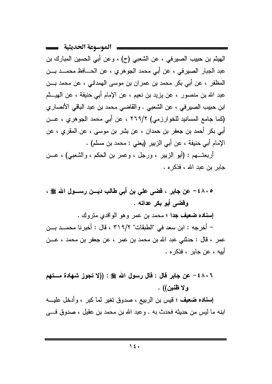 الهيثم بن حبيب الصيرفي، عن الشعبي (ح)، وعن أبي الحسين المبارك بن عبد الجبار الصيرفي، عن أبي محمد الجوهري، عن الحافظ محمد بن المظفر، عن أبي بكر محمد بن عمران بن موسى الهمداني، عن محمد بن عبد الله بن منصور، عن يزيد بن نعيم، عن الإمام أبي حنيفة، عن الهيثم ابن حبيب الصيرفي، عن الشعبي. والقاضي محمد بن عبد الباقي الأنصاري (كما جامع المسانيد للخوارزمي) ٢/ ٢٦٩، عن أبي محمد الجوهري، عن أبي بكر أحمد بن جعفر بن حمدان، عن بشر بن موسى، عن المقري، عن الإمام أبي حنيفة، عن أبي الزبير (يعني: محمد بن مسلم).