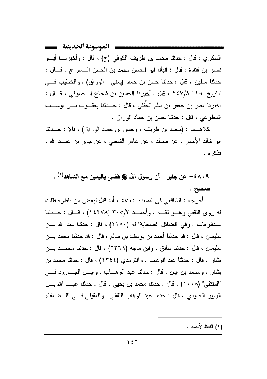 كلاهما: (محمد بن طريف، وحسن بن حماد الوراق)، قالا: حدثنا أبو خالد الأحمر، عن مجالد، عن عامر الشعبي، عن جابر بن عبد الله، فذكره.