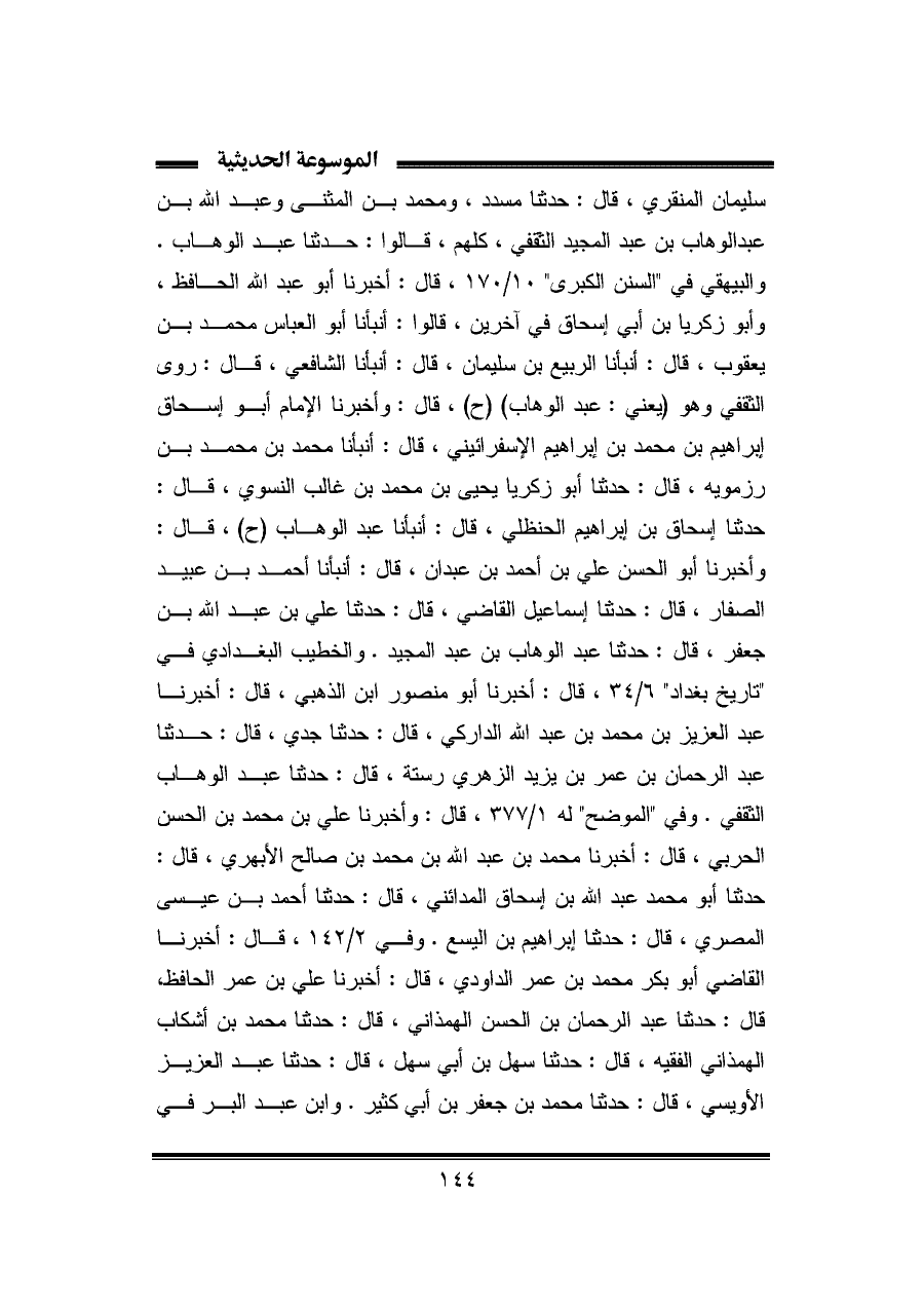 سليمان المنقري، قال: حدثنا مسدد، ومحمد بن المثنى وعبد الله بن عبد الوهاب بن عبد المجيد الثقفي، كلهم، قالوا: حدثنا عبد الوهاب. والبيهقي في "السنن الكبرى" ١٠/ ١٧٠، قال: أخبرنا أبو عبد الله الحافظ، وأبو زكريا بن أبي إسحاق في آخرين، قالوا: أنبأنا أبو العباس محمد بن يعقوب، قال: أنبأنا الربيع بن سليمان، قال: أنبأنا الشافعي، قال: روى الثقفي وهو (يعني: عبد الوهاب) (ح)، قال: وأخبرنا الإمام أبو إسحاق إبراهيم بن محمد بن إبراهيم الإسفرائيني، قال: أنبأنا محمد بن محمد بن رزمويه، قال: حدثنا أبو زكريا يحيى بن محمد بن غالب النسوي، قال: حدثنا إسحاق بن إبراهيم الحنظلي، قال: أنبأنا عبد الوهاب (ح)، قال: وأخبرنا أبو الحسن علي بن أحمد بن عبدان، قال: أنبأنا أحمد بن عبيد الصفار، قال: حدثنا إسماعيل القاضي، قال: حدثنا علي بن عبد الله بن جعفر، قال: حدثنا عبد الوهاب بن عبد المجيد. والخطيب البغدادي في "تاريخ بغداد" ٦/ ٣٤، قال: أخبرنا أبو منصور ابن الذهبي، قال: أخبرنا عبد العزيز بن محمد بن عبد الله الداركي، قال: حدثنا جدي، قال: حدثنا عبد الرحمان بن عمر بن يزيد الزهري رستة، قال: حدثنا عبد الوهاب الثقفي. وفي "الموضح" له ١/ ٣٧٧، قال: وأخبرنا علي بن محمد بن الحسن الحربي، قال: أخبرنا محمد بن عبد الله بن محمد بن صالح الأبهري، قال: حدثنا أبو محمد عبد الله بن إسحاق المدائني، قال: حدثنا أحمد بن عيسى المصري، قال: حدثنا إبراهيم بن اليسع. وفي ٢/ ١٤٢، قال: أخبرنا القاضي أبو بكر محمد بن عمر الداودي، قال: أخبرنا علي بن عمر الحافظ، قال: حدثنا عبد الرحمان بن الحسن الهمذاني، قال: حدثنا محمد بن أشكاب الهمذاني الفقيه، قال: حدثنا سهل بن أبي سهل، قال: حدثنا عبد العزيز الأويسي، قال: حدثنا محمد بن جعفر بن أبي كثير. وابن عبد البر في