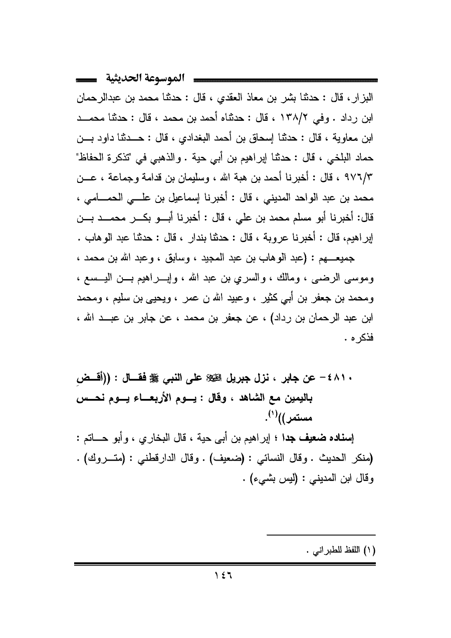 ٤٨١٠ - عن جابر، نزل جبريل -عَلَيْهِ السَّلَامُ- علي النبي -صلى الله عليه وسلم- فقال: "أقضِ باليمين مع الشاهد، وقال: يوم الأربعاء يوم نحس مستمر" (¬١).