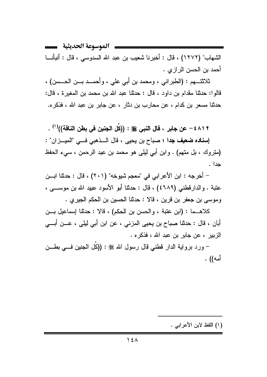 ٤٨١٢ - عن جابر، قال النبي -صلى الله عليه وسلم-: "كُل الجنين في بطن الناقة" (¬١).