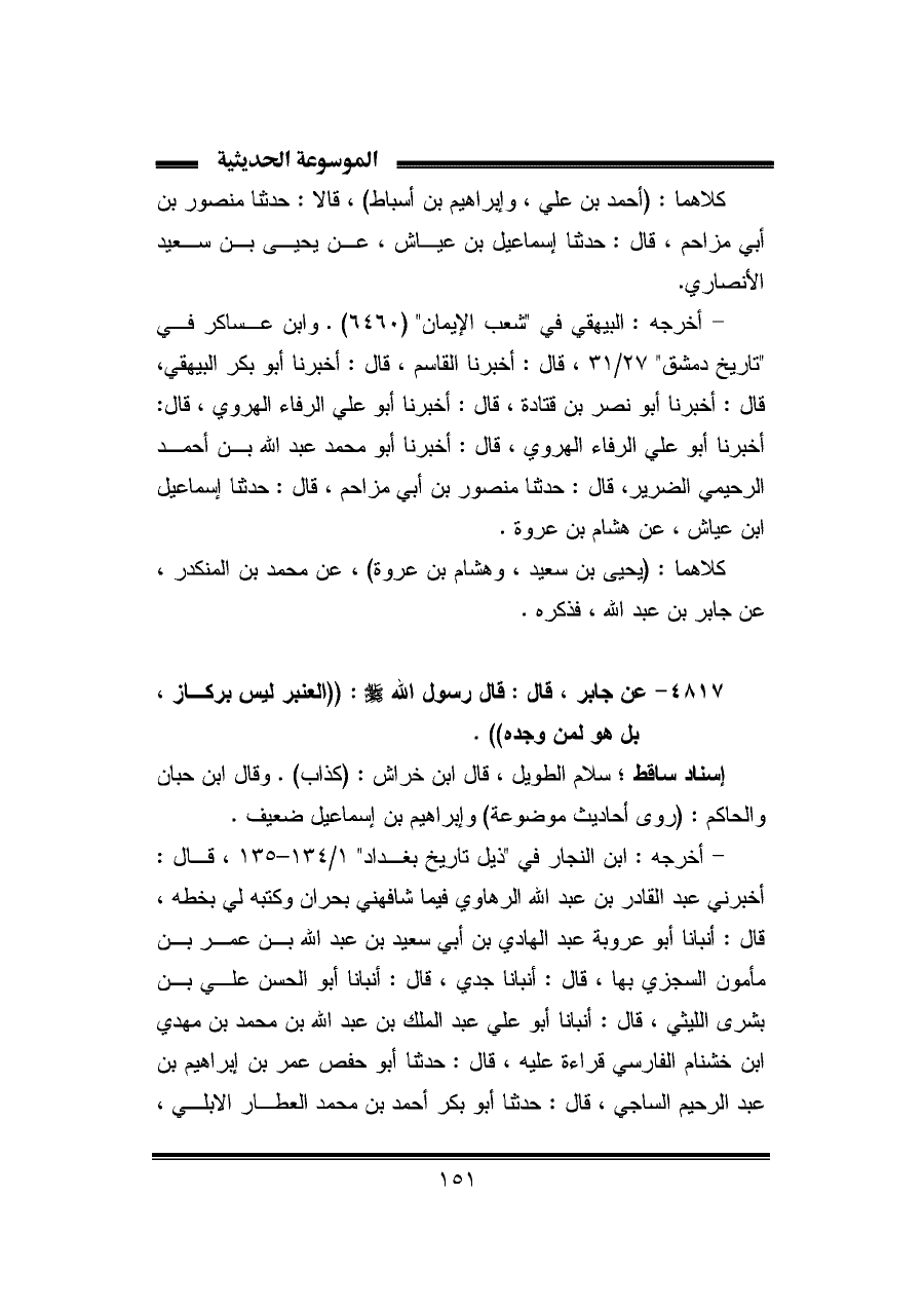 كلاهما: (أحمد بن علي، وإبراهيم بن أسباط)، قالا: حدثنا منصور بن أبي مزاحم، قال: حدثنا إسماعيل بن عياش، عن يحيى بن سعيد الأنصاري.
