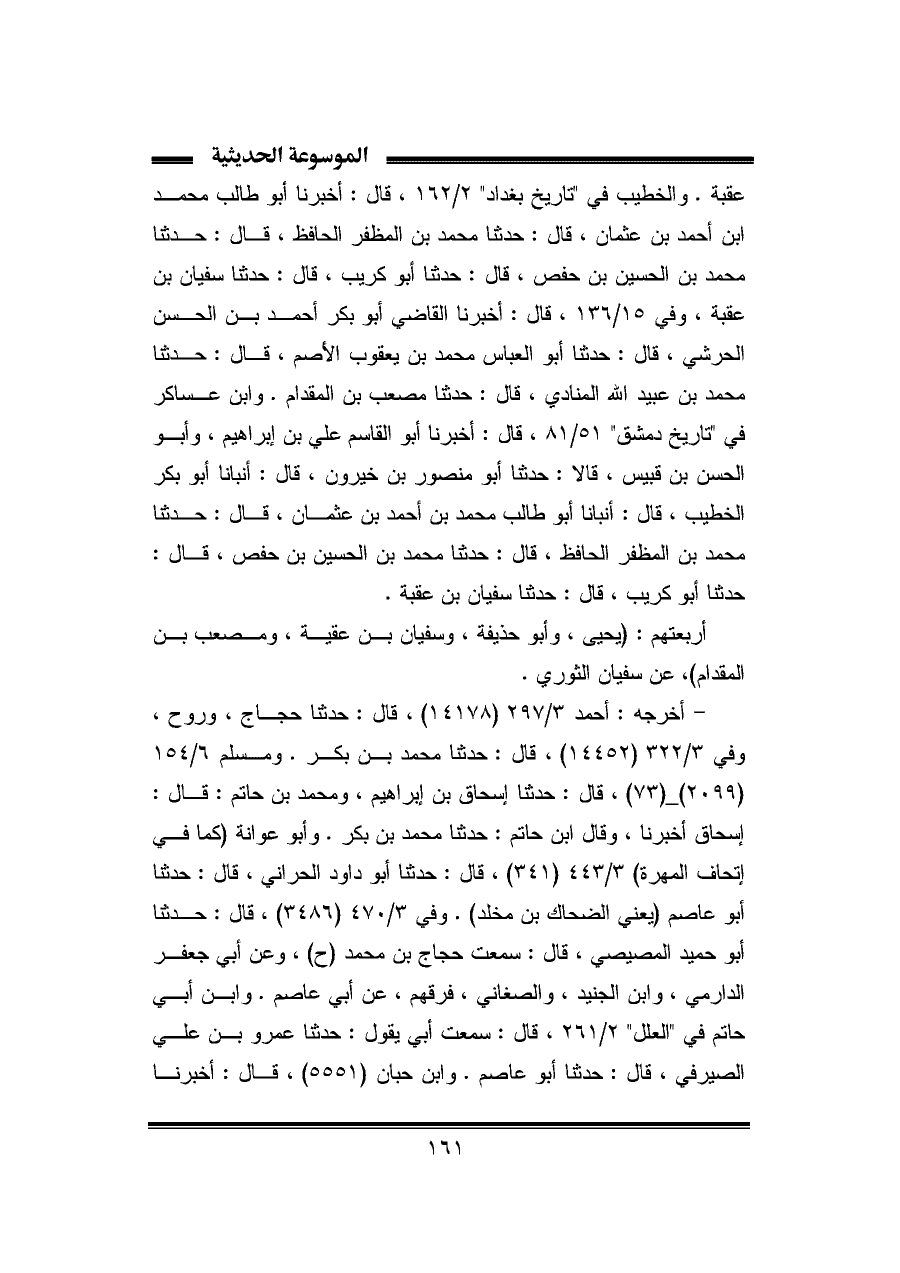 عقبة. والخطيب في "تاريخ بغداد" ٢/ ١٦٢، قال: أخبرنا أبو طالب محمد ابن أحمد بن عثمان، قال: حدثنا محمد بن المظفر الحافظ، قال: حدثنا محمد بن الحسين بن حفص، قال: حدثنا أبو كريب، قال: حدثنا سفيان بن عقبة، وفي ١٥/ ١٣٦، قال: أخبرنا القاضي أبو بكر أحمد بن الحسن الحرشي، قال: حدثنا أبو العباس محمد بن يعقوب الأصم، قال: حدثنا محمد بن عبيد الله المنادي، قال: حدثنا مصعب بن المقدام. وابن عساكر في "تاريخ دمشق" ٥١/ ٨١، قال: أخبرنا أبو القاسم علي بن إبراهيم، وأبو الحسن بن قبيس، قالا: حدثنا أبو منصور بن خيرون، قال: أنبأنا أبو بكر الخطيب، قال: أنبأنا أبو طالب محمد بن أحمد بن عثمان، قال: حدثنا محمد بن المظفر الحافظ، قال: حدثنا محمد بن الحسين بن حفص، قال: حدثنا أبو كريب، قال: حدثنا سفيان بن عقبة.