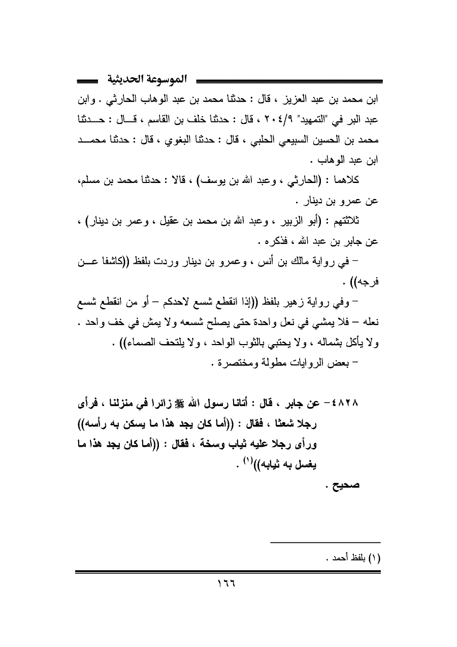 - وفي رواية زهير بلفظ "إذا انقطع شسع لأحدكم -أو من انقطع شسع نعله- فلا يمشي في نعل واحدة حتى يصلح شسعه ولا يمش في خف واحد. ولا يأكل بشماله، ولا يحتبي بالثوب الواحد، ولا يلتحف الصماء".