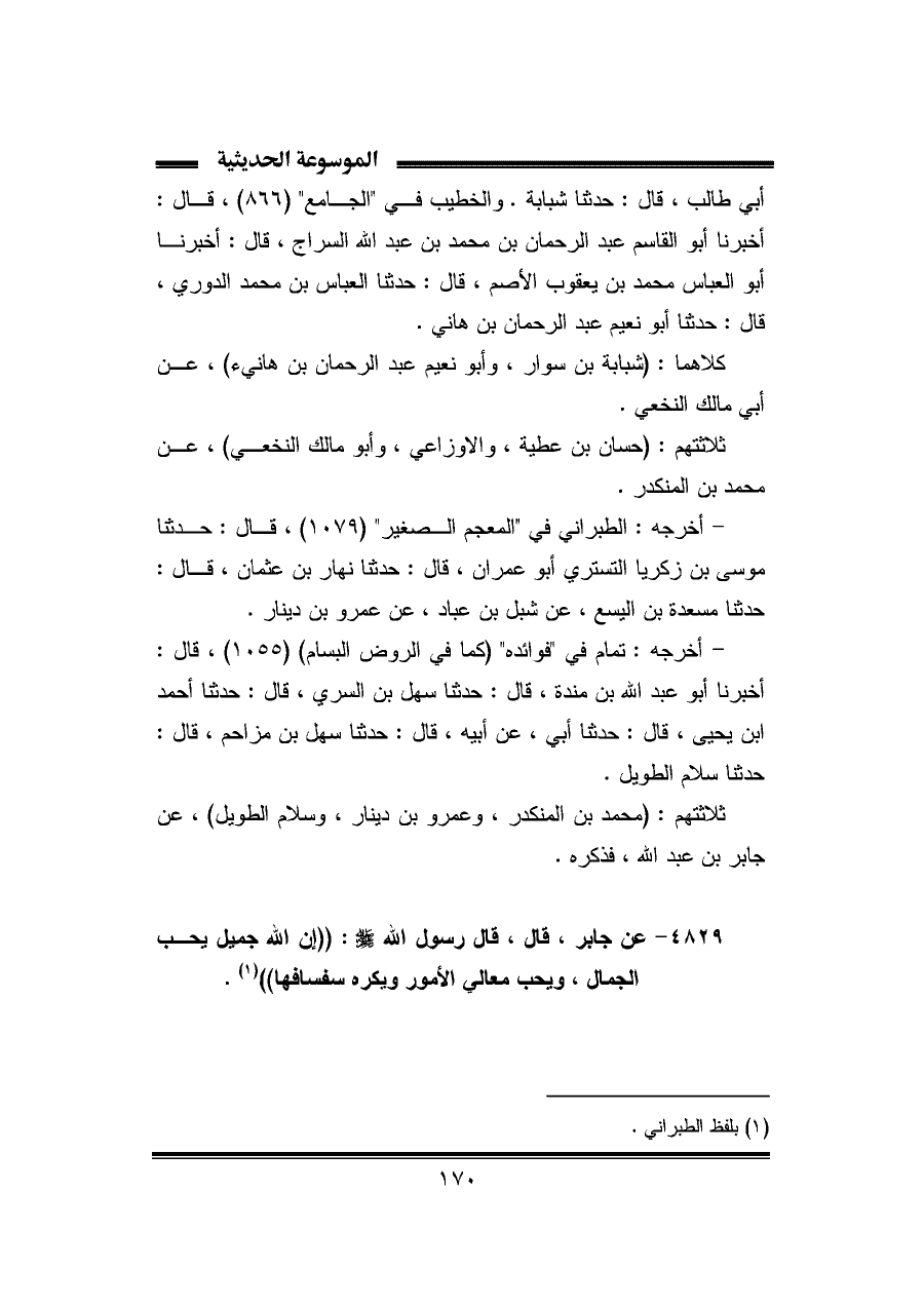 ٤٨٢٩ - عن جابر، قال، قال رسول الله -صلى الله عليه وسلم-: "إن الله جميل يحب الجمال، ويحب معالي الأمور ويكره سفسافها" (¬١).