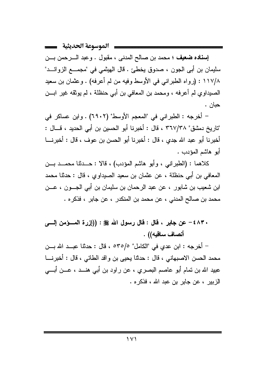 ٤٨٣٠ - عن جابر، قال: قال رسول الله -صلى الله عليه وسلم-: "إزرة المؤمن إلى أنصاف ساقيه".
