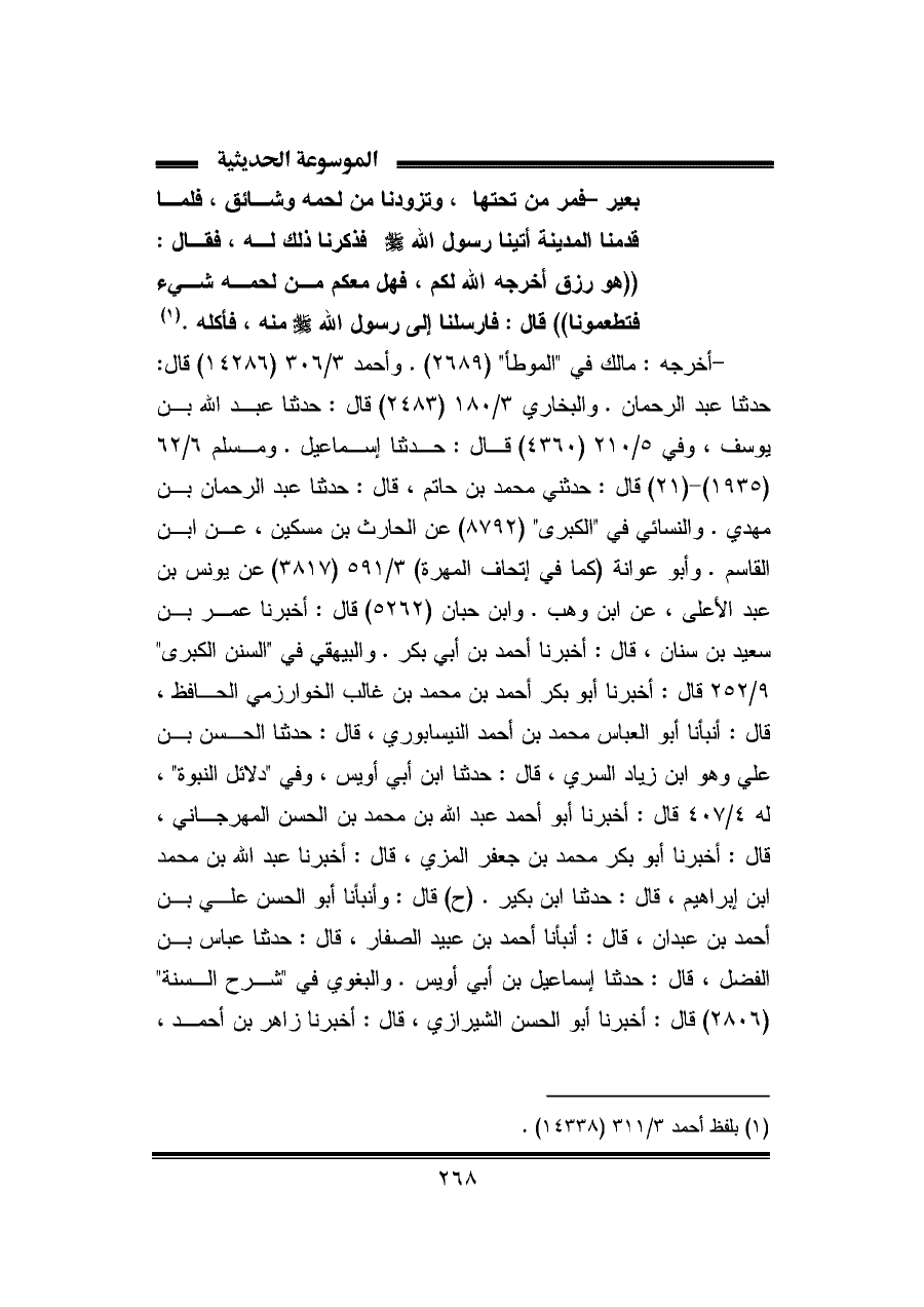 بعير - فمر من تحتها، وتزودنا من لحمه وشائق، فلما قدمنا المدينة أتينا رسول الله -صلى الله عليه وسلم- فذكرنا ذلك له، فقال: "هو رزق أخرجه الله لكم، فهل معكم من لحمه شيء فتطعمونا" قال: فأرسلنا إلى رسول الله -صلى الله عليه وسلم- منه، فأكله. (¬١)