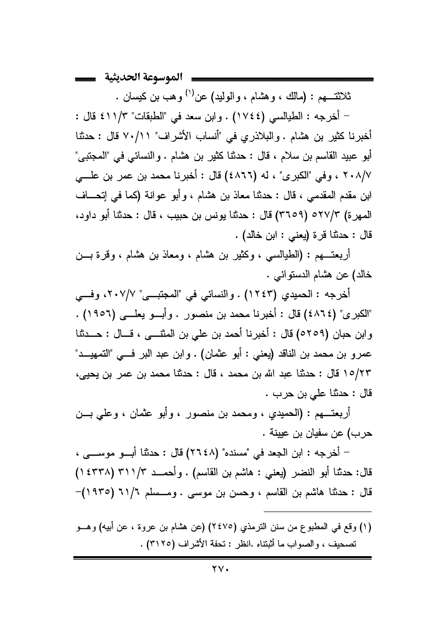 أربعتهم: (الطيالسي، وكثير بن هشام، ومعاذ بن هشام، وقرة بن خالد) عن هشام الدستوائي.