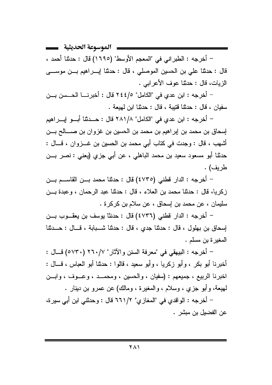 - أخرجه: الواقدي في "المغازي" ٢/ ٦٦١ قال: وحدثني ابن أبي سيرة، عن الفضيل بن مبشر.