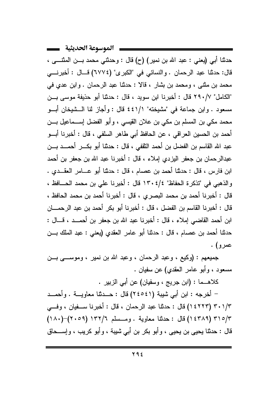 حدثنا أبي (يعني: عبد الله بن نمير) (ح) قال: وحدثني محمد بن المثنى، قال: حدثنا عبد الرحمان. والنسائي في "الكبرى" (٦٧٧٤) قال: أخبرني محمد بن مثنى، ومحمد بن بشار، قالا: حدثنا عبد الرحمان. وابن عدي في "الكامل" ٧/ ٢٩٠ قال: أخبرنا ابن سويد، قال: حدثنا أبو حذيفة موسى بن مسعود. وابن جماعة في "مشيخته" ١/ ٤٤١ قال: وأجاز لنا الشيخان أبو محمد مكي بن المسلم بن مكي بن علان القيسي، وأبو الفضل إسماعيل بن أحمد بن الحسين العراقي، عن الحافظ أبي طاهر السلفي، قال: أخبرنا أبو عبد الله القاسم بن الفضل بن أحمد الثقفي، قال: حدثنا أبو بكر أحمد بن عبد الرحمان بن جعفر اليزدي إملاء، قال: أخبرنا عبد الله بن جعفر بن أحمد بن فارس، قال: حدثنا أحمد بن عصام، قال: حدثنا أبو عامر العقدي. والذهبي في "تذكرة الحفاظ" ٤/ ١٣٠٤ قال: أخبرنا علي بن محمد الحافظ، قال: أخبرنا أحمد بن محمد البصري، قال: أخبرنا أحمد بن محمد الحافظ، قال: أخبرنا القاسم بن الفضل، قال: أخبرنا أبو بكر أحمد بن عبد الرحمان بن أحمد القاضي إملاء، قال: أخبرنا عبد الله بن جعفر بن أحمد، قال: حدثنا أحمد بن عصام، قال: حدثنا أبو عامر العقدي (يعني: عبد الملك بن عمرو).