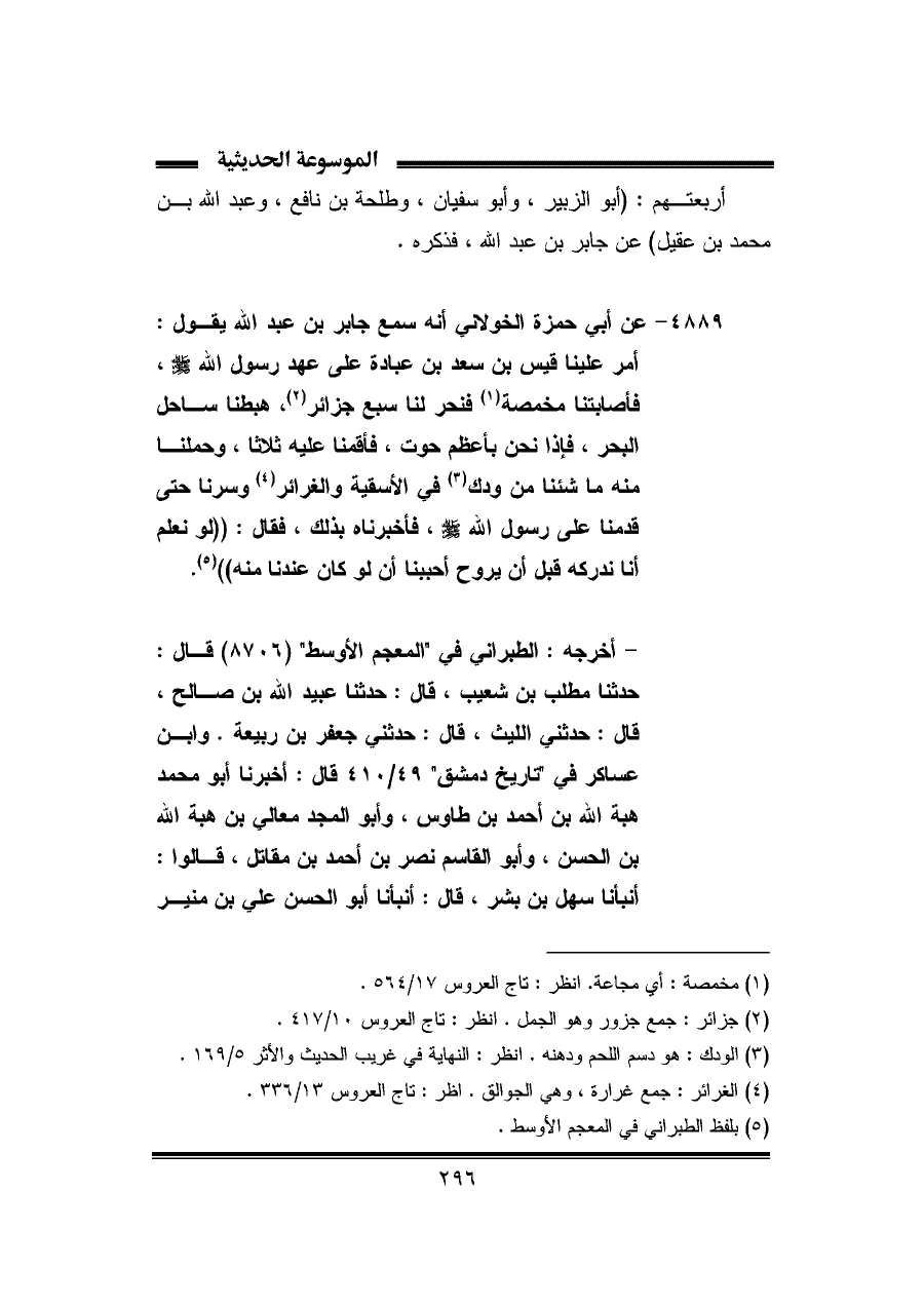 ٤٨٨٩ - عن أبي حمزة الخولاني أنه سمع جابر بن عبد الله يقول: أمر علينا قيس بن سعد بن عبادة على عهد رسول الله - صلى الله عليه وسلم -، فأصابتنا مخمصة (¬١) فنحر لنا سبع جزائر (¬٢)، هبطنا ساحل البحر، فإذا نحن بأعظم حوت، فأقمنا عليه ثلاثا، وحملنا منه ما شئنا من ودك (¬٣) في الأسقية والغرائر (¬٤) وسرنا حتى قدمنا على رسول الله - صلى الله عليه وسلم -، فأخبرناه بذلك، فقال: ((لو نعلم أنا ندركه قبل أن يروح أحببنا أن لو كان عندنا منه)) (¬٥).