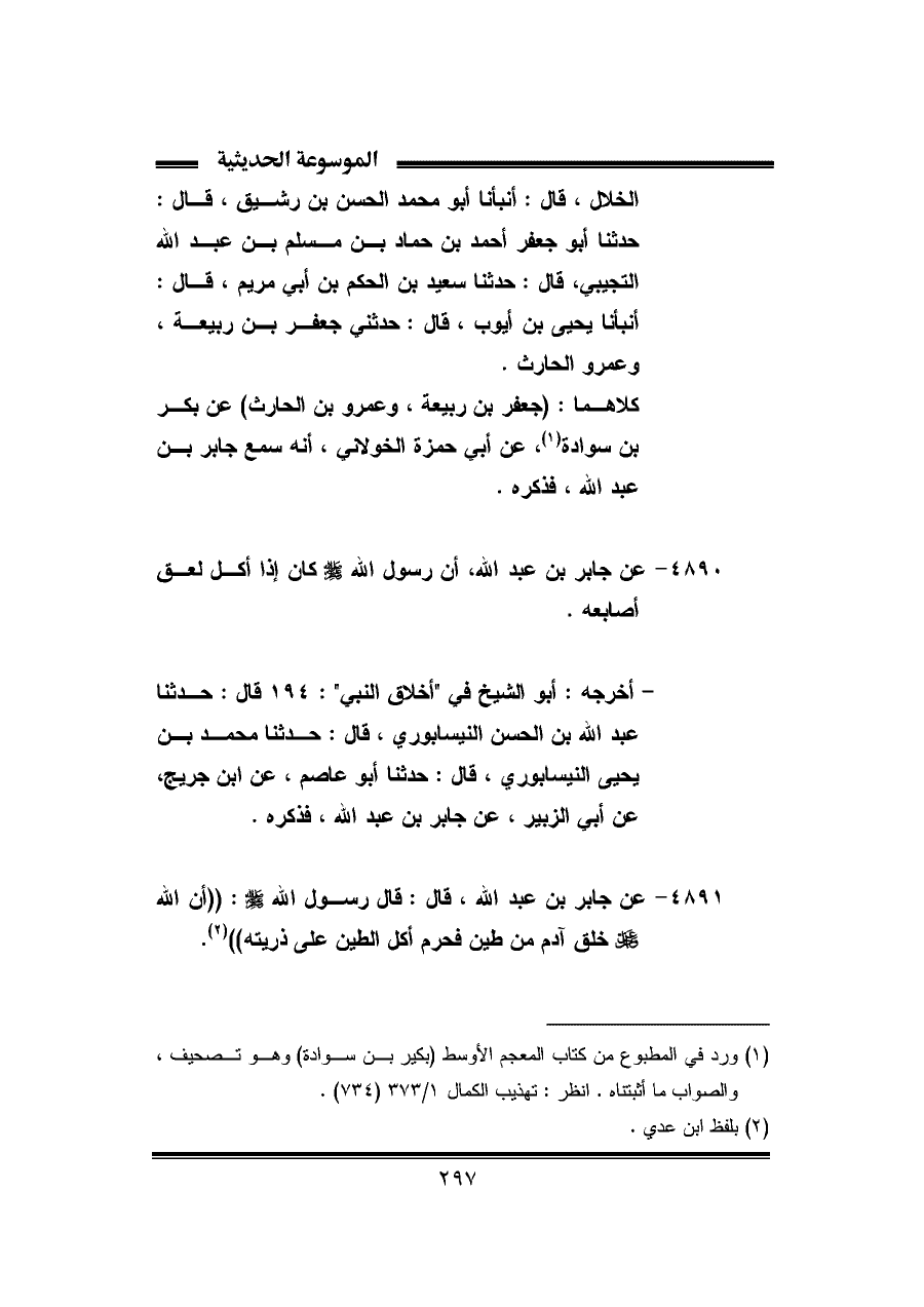٤٨٩١ - عن جابر بن عبد الله، قال: قال رسول الله - صلى الله عليه وسلم -: ((أن الله - عز وجل - خلق آدم من طين فحرم أكل الطين على ذريته)) (¬٢).