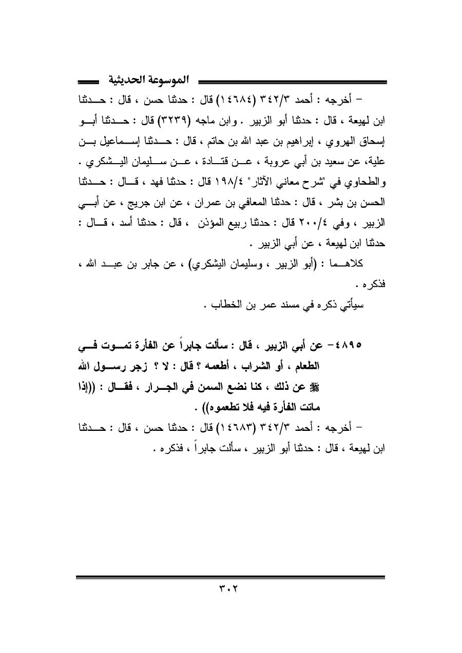 ٤٨٩٥ - عن أبي الزبير، قال: سألت جابرًا عن الفأرة تموت في الطعام، أو الشراب، أطعمه؟ قال: لا؟ زجر رسول الله - صلى الله عليه وسلم - عن ذلك، كنا نضع السمن في الجرار، فقال: ((إذا ماتت الفأرة فيه فلا تطعموه)).