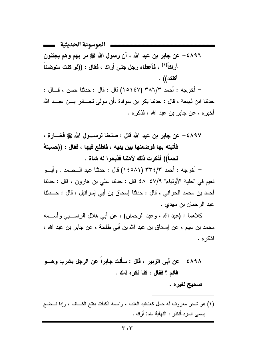 ٤٨٩٦ - عن جابر بن عبد الله، أن رسول الله - صلى الله عليه وسلم - مر بهم وهم يجتنون أراكًا (¬١)، فأعطاه رجل جني أراك، فقال: ((لو كنت متوضئًا أكلته)).