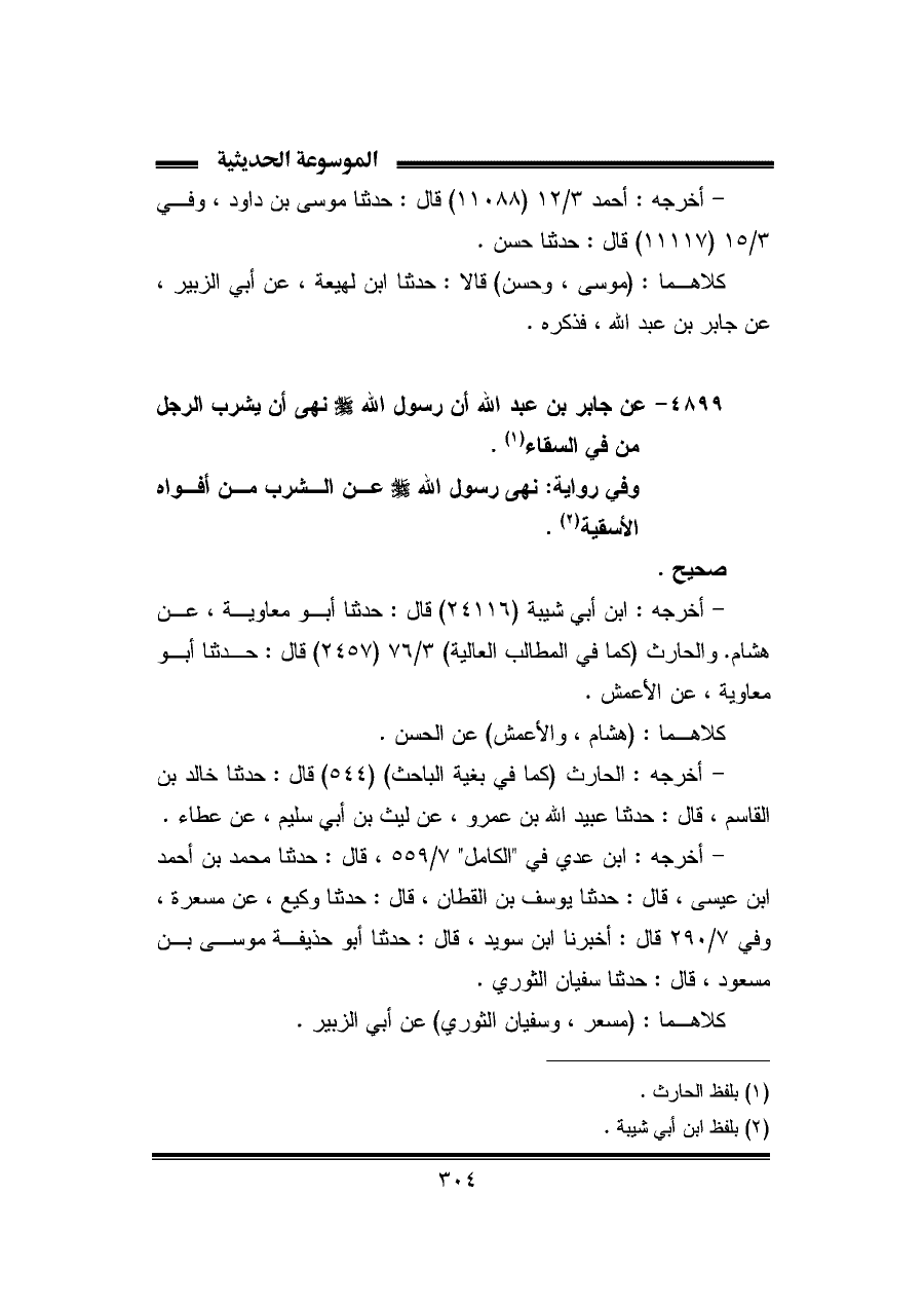 ٤٨٩٩ - عن جابر بن عبد الله أن رسول الله - صلى الله عليه وسلم - نهى أن يشرب الرجل من في السقاء (¬١).