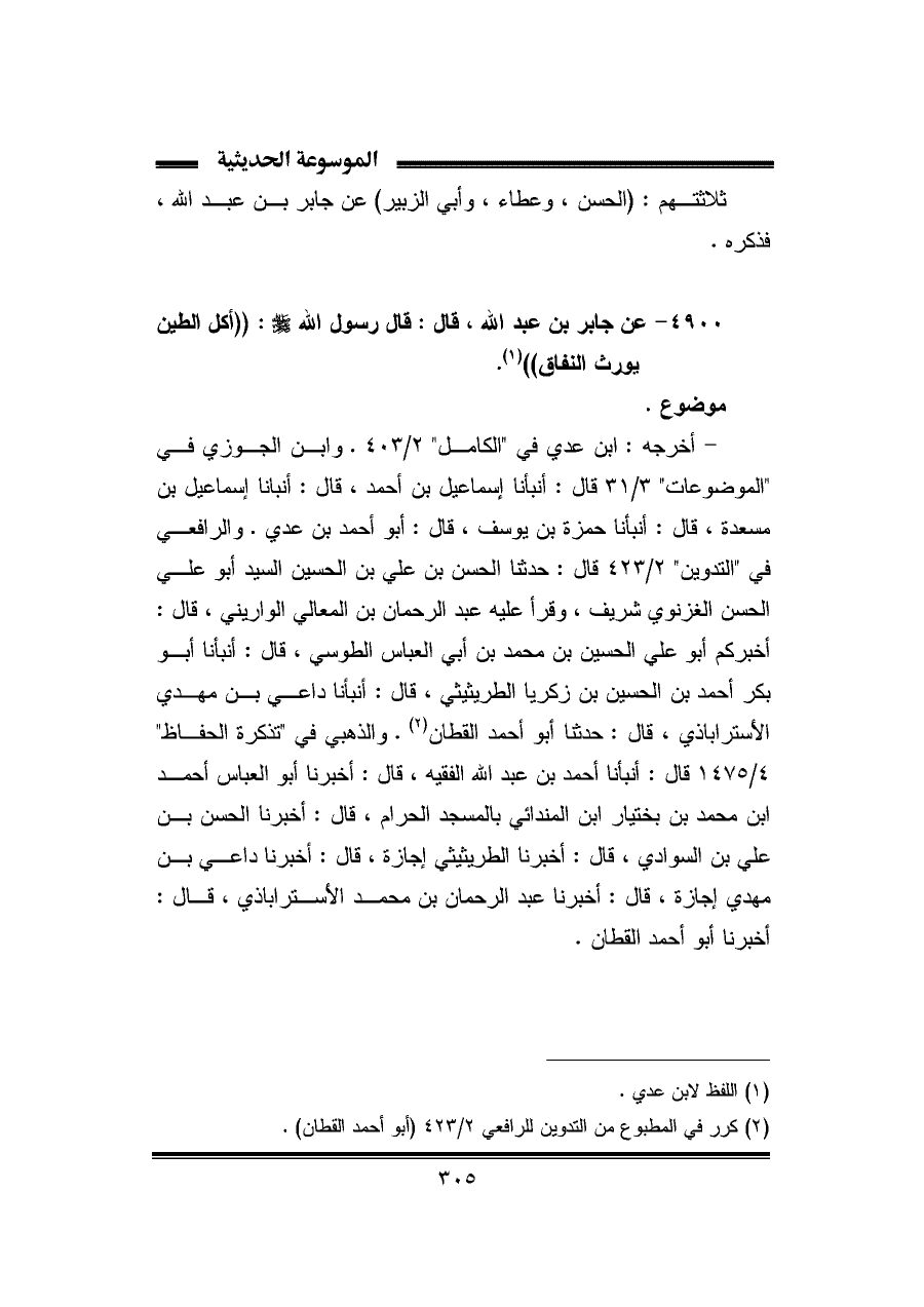 - أخرجه: ابن عدي في "الكامل" ٢/ ٤٠٣. وابن الجوزي في "الموضوعات" ٣/ ٣١ قال: أنبأنا إسماعيل بن أحمد، قال: أنبأنا إسماعيل بن مسعدة، قال: أنبأنا حمزة بن يوسف، قال: أبو أحمد بن عدي. والرافعي في "التدوين" ٢/ ٤٢٣ قال: حدثنا الحسن بن علي بن الحسين السيد أبو علي الحسن الغزنوي شريف، وقرأ عليه عبد الرحمان بن المعالي الواريني، قال: أخبركم أبو علي الحسين بن محمد بن أبي العباس الطوسي، قال: أنبأنا أبو بكر أحمد بن الحسين بن زكريا الطريثيثي، قال: أنبأنا داعي بن مهدي الأستراباذي، قال: حدثنا أبو أحمد القطان (¬٢). والذهبي في "تذكرة الحفاظ" ٤/ ١٤٧٥ قال: أنبأنا أحمد بن عبد الله الفقيه، قال: أخبرنا أبو العباس أحمد بن محمد بن بختيار ابن المندائي بالمسجد الحرام، قال: أخبرنا الحسن بن علي بن السوادي، قال: أخبرنا الطريثيثي إجازة، قال: أخبرنا داعي بن مهدي إجازة، قال: أخبرنا عبد الرحمان بن محمد الأستراباذي، قال: أخبرنا أبو أحمد القطان.