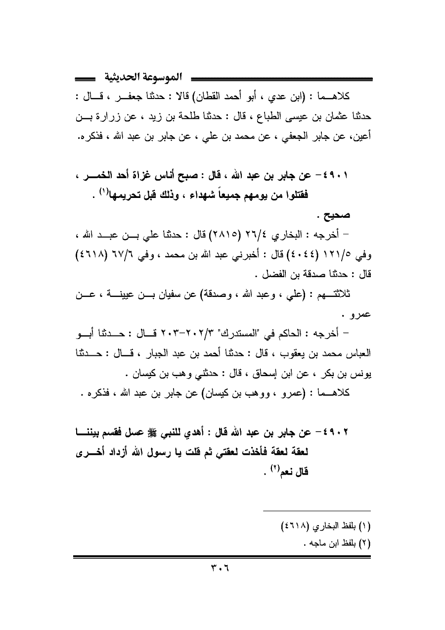 كلاهما: (ابن عدي، أبو أحمد القطان) قالا: حدثنا جعفر، قال: حدثنا عثمان بن عيسى الطباع، قال: حدثنا طلحة بن زيد، عن زرارة بن أعين، عن جابر الجعفي، عن محمد بن علي، عن جابر بن عبد الله، فذكره.